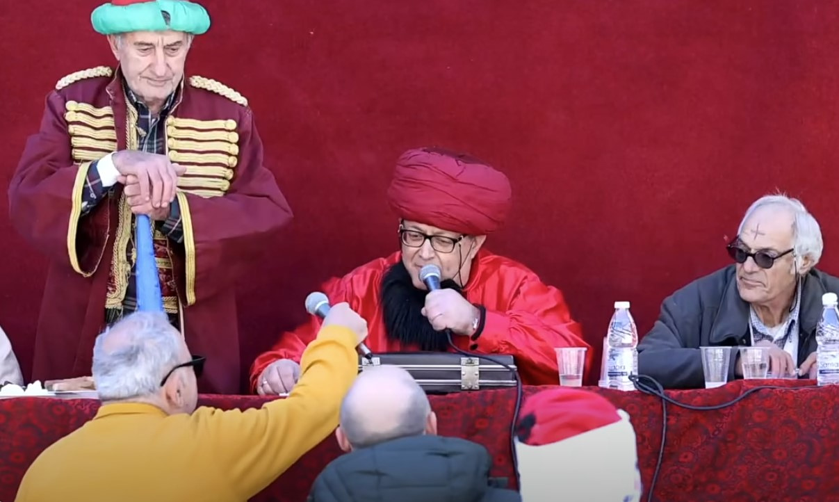 «Σήμερα κάνουμε ένα παλιό έθιμο και κάνουμε πλάκα, αν σας ενοχλεί μπορείτε να φύγετε και να μην ξανάρθετε εδώ» απάντησε άλλος παρευρισκόμενος παίρνοντας το μικρόφωνο.