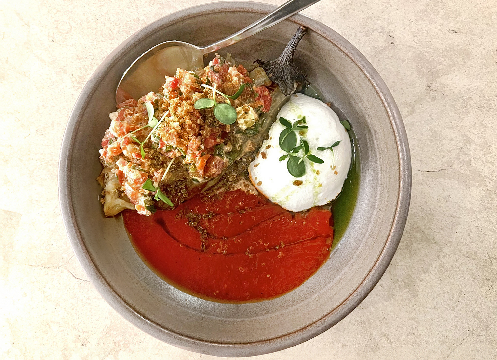 Καπνιστή μελιτζάνα με κρέμα πιπεριάς Φλιωρίνης, μους φέτας, γιαούρτι, μυρωδικά και τηγανητή κινόα από το μενού του Ράντικαλ. Φωτό: Αλέξανδρος Αλεξανδρής