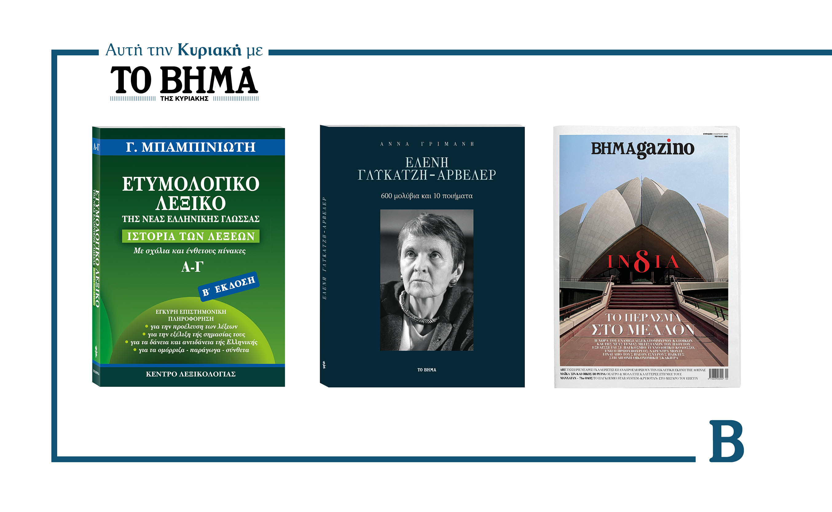 Την Κυριακή 1 Μαρτίου το «Βήμα της Κυριακής» κυκλοφορεί με συναρπαστικές προσφορές: Ο πρώτος τόμος του Ετυμολογικού Λεξικού της Νέας Ελληνικής Γλώσσας του καθηγητή Γεώργιου Μπαμπινιώτη, το βιβλίο «Ελένη Γλυκατζή-Αρβελέρ – 600 μολύβια και 10 ποιήματα», και όπως κάθε Κυριακή, ΒΗΜΑGAZINO.