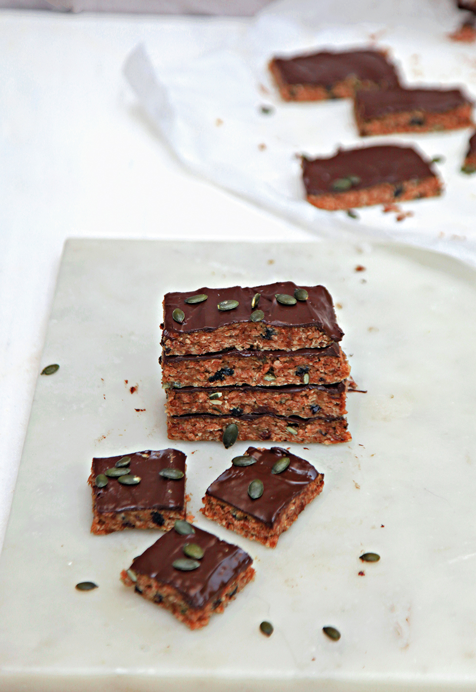 Με ένα κοφτερό μαχαίρι, κόβουμε ομοιόμορφα το περιεχόμενο του ταψιού σε 12 μπάρες, τις οποίες διατηρούμε στο ψυγείο μέχρι να τις καταναλώσουμε.