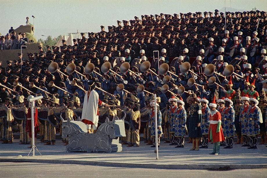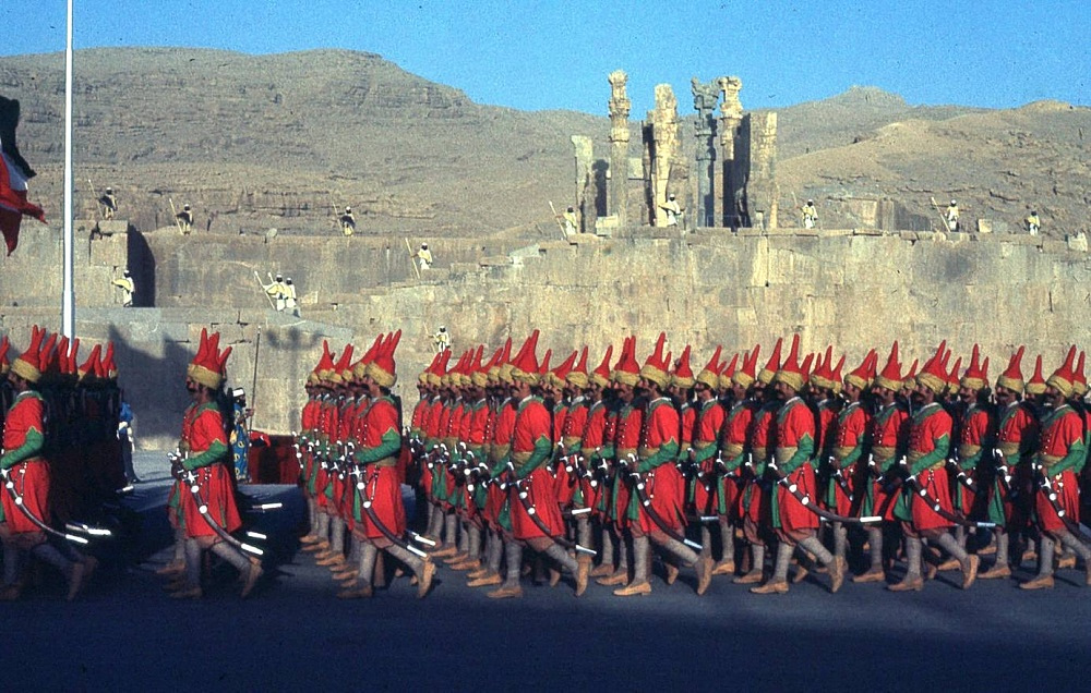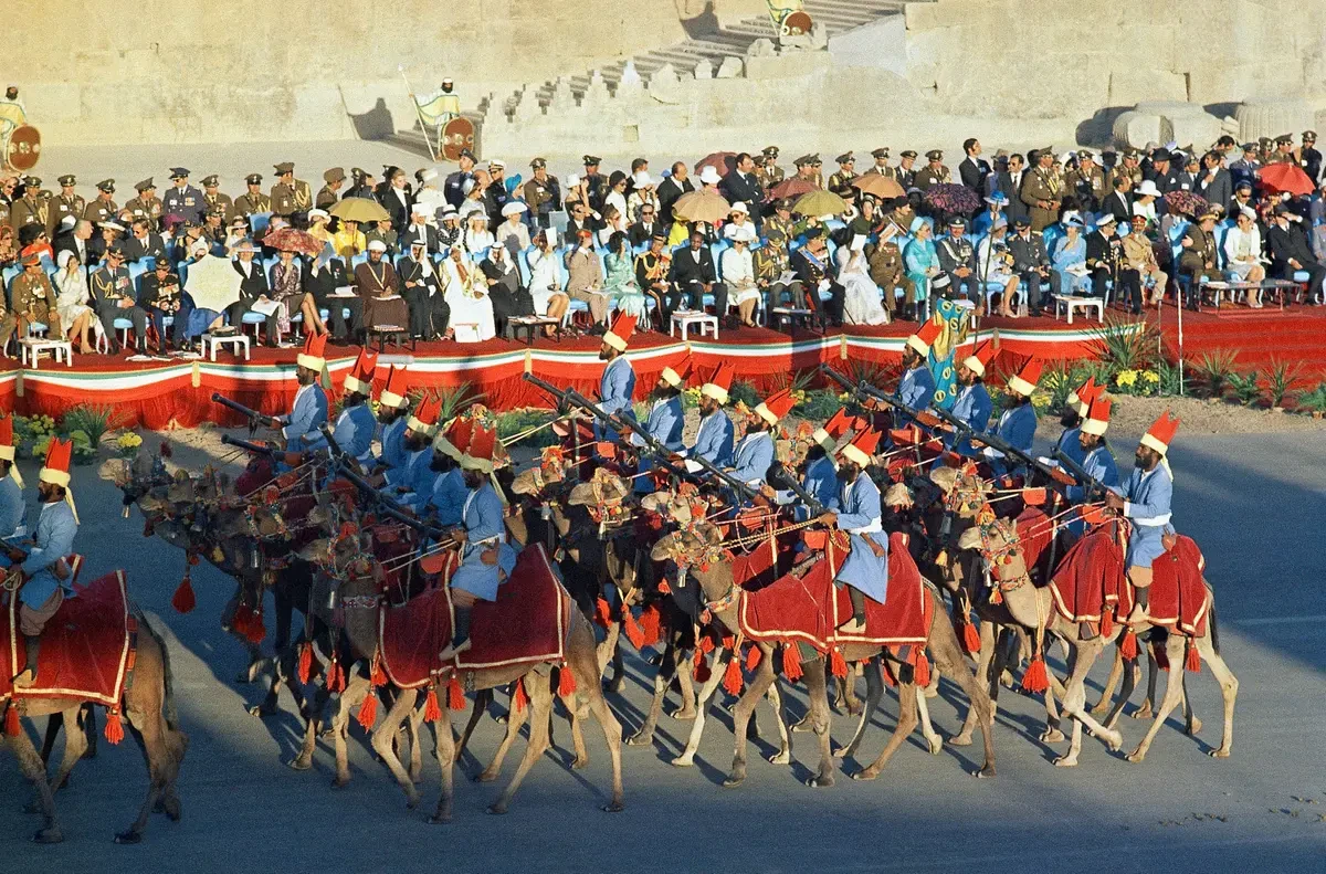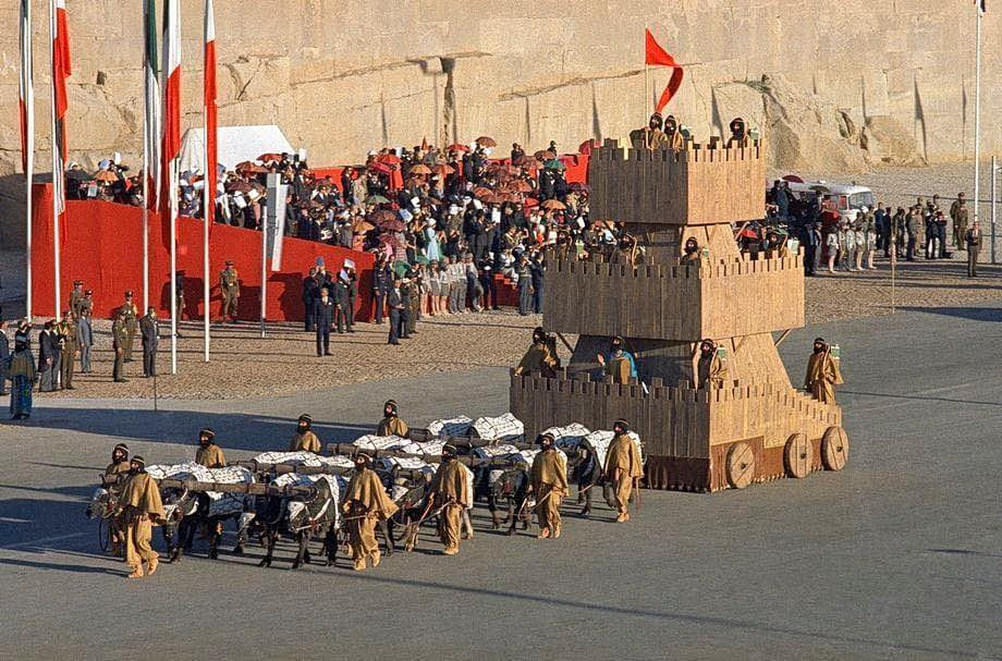 Χιλιάδες στρατιώτες παρέλασαν, ντυμένοι με ακριβή αντίγραφα στολών από κάθε δυναστεία της Περσίας. Ήταν μια υπερπαραγωγή επιπέδου Χόλιγουντ. Υπήρχαν πολεμιστές της αρχαιότητας με ψεύτικες γενειάδες κολλημένες στα πρόσωπά τους, πλοία κατασκευασμένα πάνω σε ρόδες που τα έσερναν άλογα μέσα στην έρημο, και εκατοντάδες καμήλες.