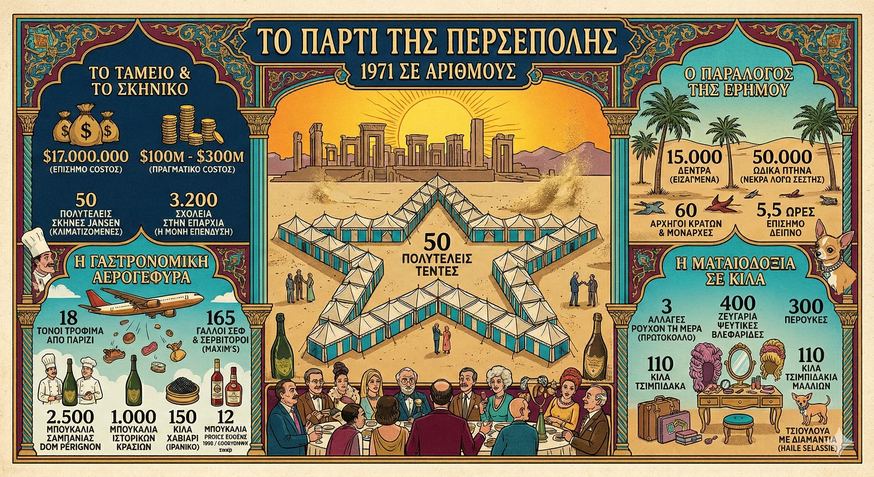 Κάπως έτσι ενορχηστρώθηκε το θρυλικό – για σωστούς αλλά και λάθος λόγους – πάρτι στην Περσέπολη. Ένα τριήμερο υπερβολής και ιρανικής εθνικής περηφάνιας, όπου το νερό ήταν πιο σπάνιο και δυσεύρετο από τη χιλιοτραγουδισμένη σαμπάνια Dom Pérignon.