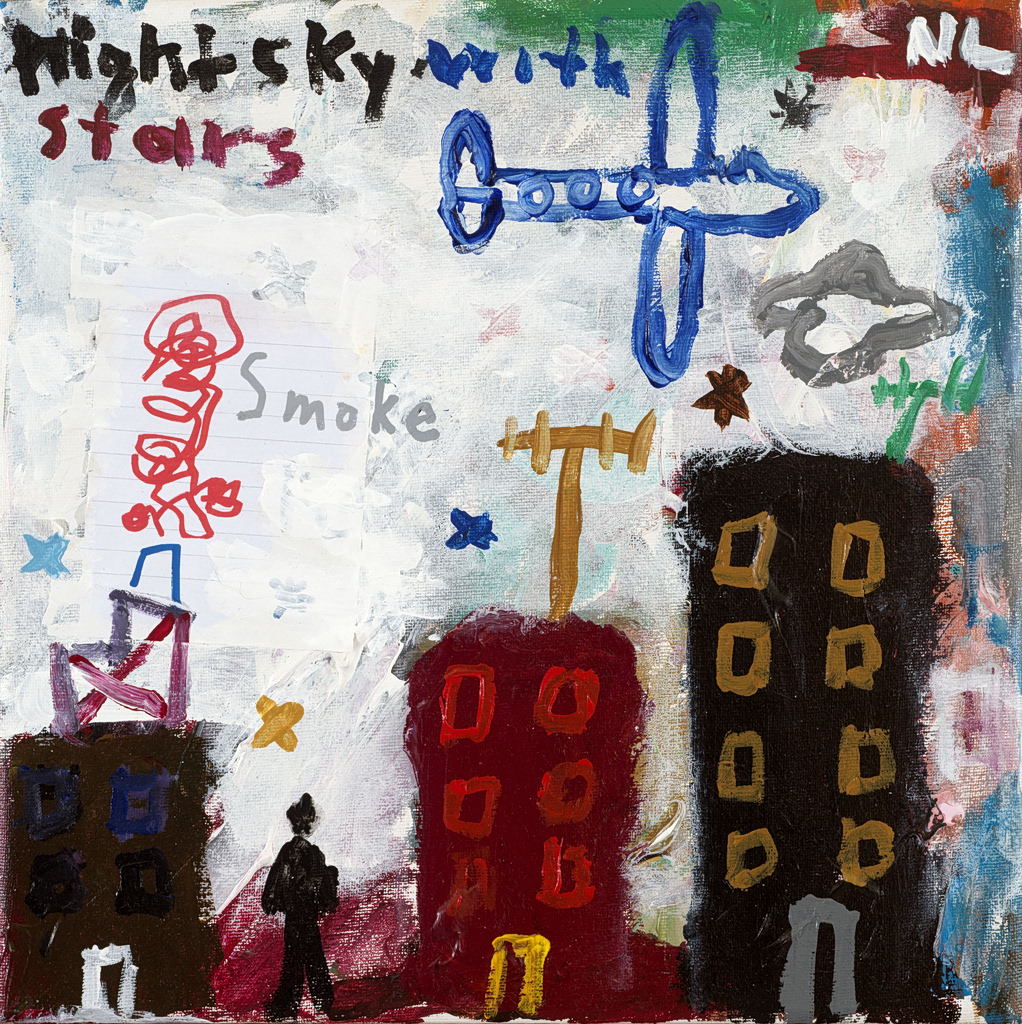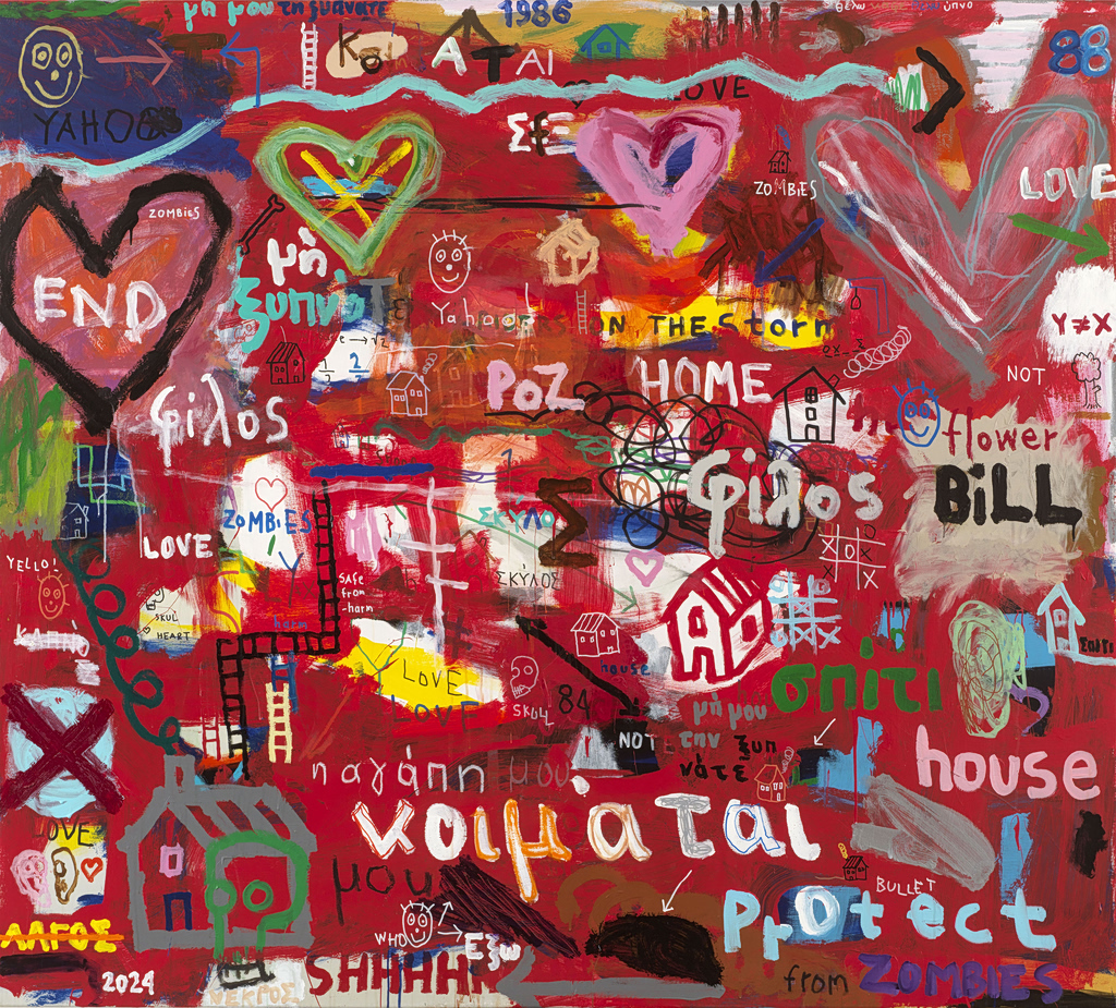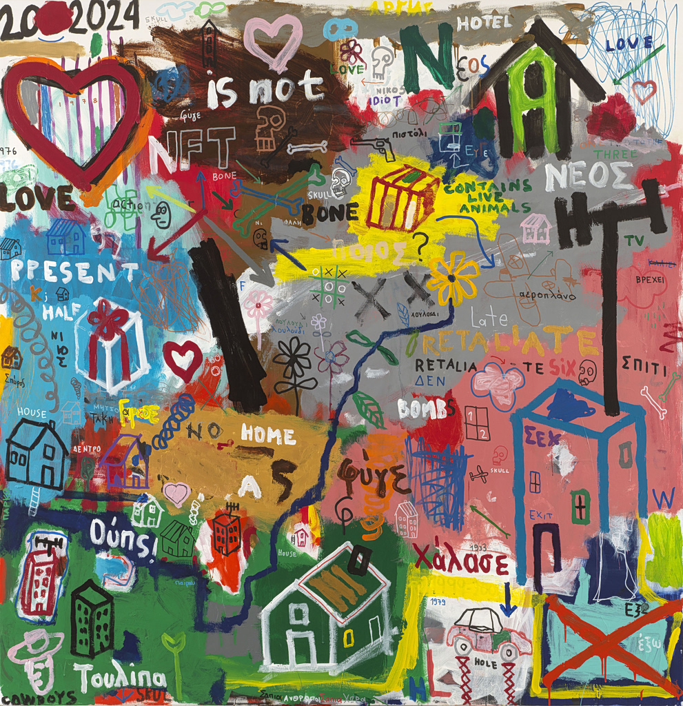 Στους πυκνούς πίνακές του, οι λέξεις λειτουργούν σαν σημειώσεις πάνω στην εικόνα, σύμβολα και αριθμοί μπλέκονται με σπίτια, κρανία και φιγούρες, ενώ το χιούμορ και ο αυτοσαρκασμός σπάνε την ένταση την κατάλληλη στιγμή.