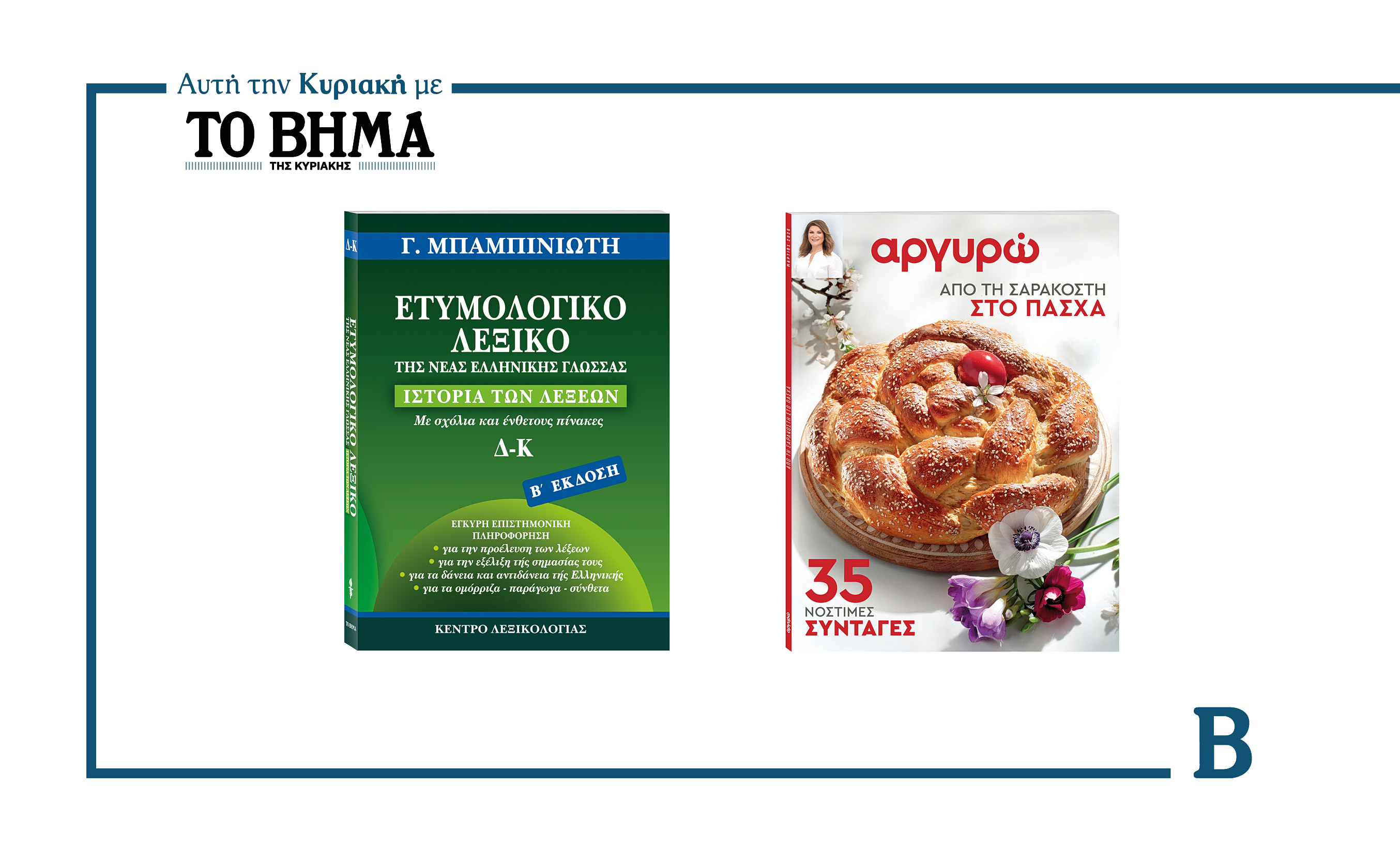 Την Κυριακή 8 Μαρτίου το «Βήμα της Κυριακής» κυκλοφορεί με συναρπαστικές προσφορές: Ο δεύτερος τόμος του Ετυμολογικού Λεξικού της Νέας Ελληνικής Γλώσσας του καθηγητή Γεώργιου Μπαμπινιώτη, 35 Σαρακοστιανές και Πασχαλινές συνταγές από την Αργυρώ Μπαρμπαρίγου, και όπως κάθε Κυριακή, ΒΗΜΑGAZINO.
