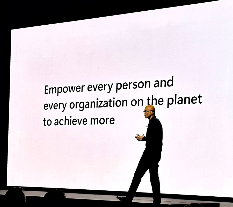 Η σιλουέτα του Σάτια Ναντέλα χανόταν μέσα στο εκτυφλωτικό λευκό της γιγαντιαίας οθόνης που βρισκόταν ακριβώς πίσω του. Όσο και αν ακούγεται παράδοξο, περισσότερο και από τον ίδιο τον πρόεδρο και CEO της Microsoft, μεγαλύτερη σημασία είχαν οι λέξεις που κάλυπταν σχεδόν όλο το ύψος του: «Empower every person and every organization on the planet to achieve more».