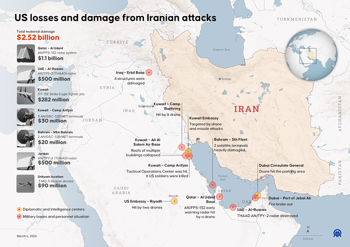 Συνολικά, το Ιράν έχει προκαλέσει ζημιές σε αμερικανικά στρατιωτικά περιουσιακά στοιχεία στην περιοχή, αξίας περίπου 2,52 δισεκατομμυρίων δολαρίων.