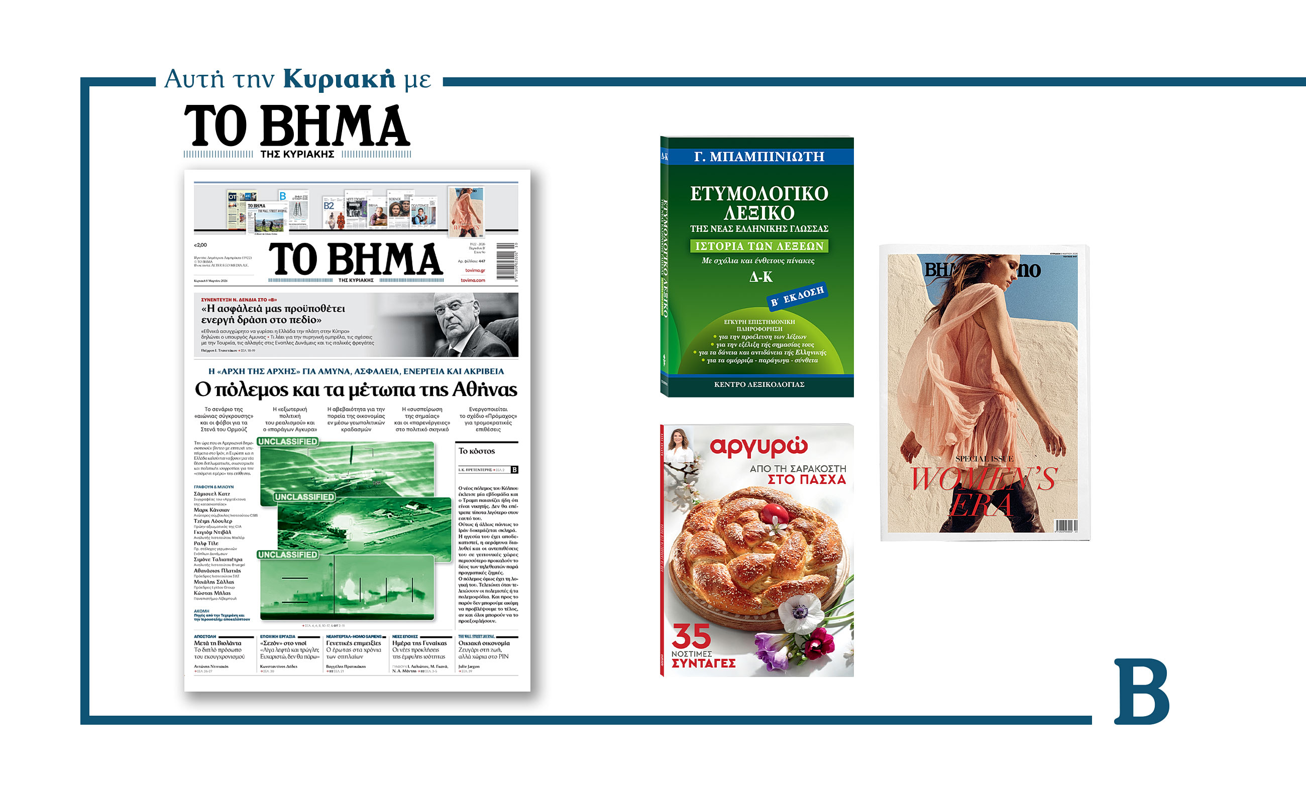 Την Κυριακή 8 Μαρτίου το «Βήμα της Κυριακής» κυκλοφορεί με συναρπαστικές προσφορές: Ο δεύτερος τόμος του Ετυμολογικού Λεξικού της Νέας Ελληνικής Γλώσσας του καθηγητή Γεώργιου Μπαμπινιώτη, 35 Σαρακοστιανές και Πασχαλινές συνταγές από την Αργυρώ Μπαρμπαρίγου, και όπως κάθε Κυριακή, ΒΗΜΑGAZINO.