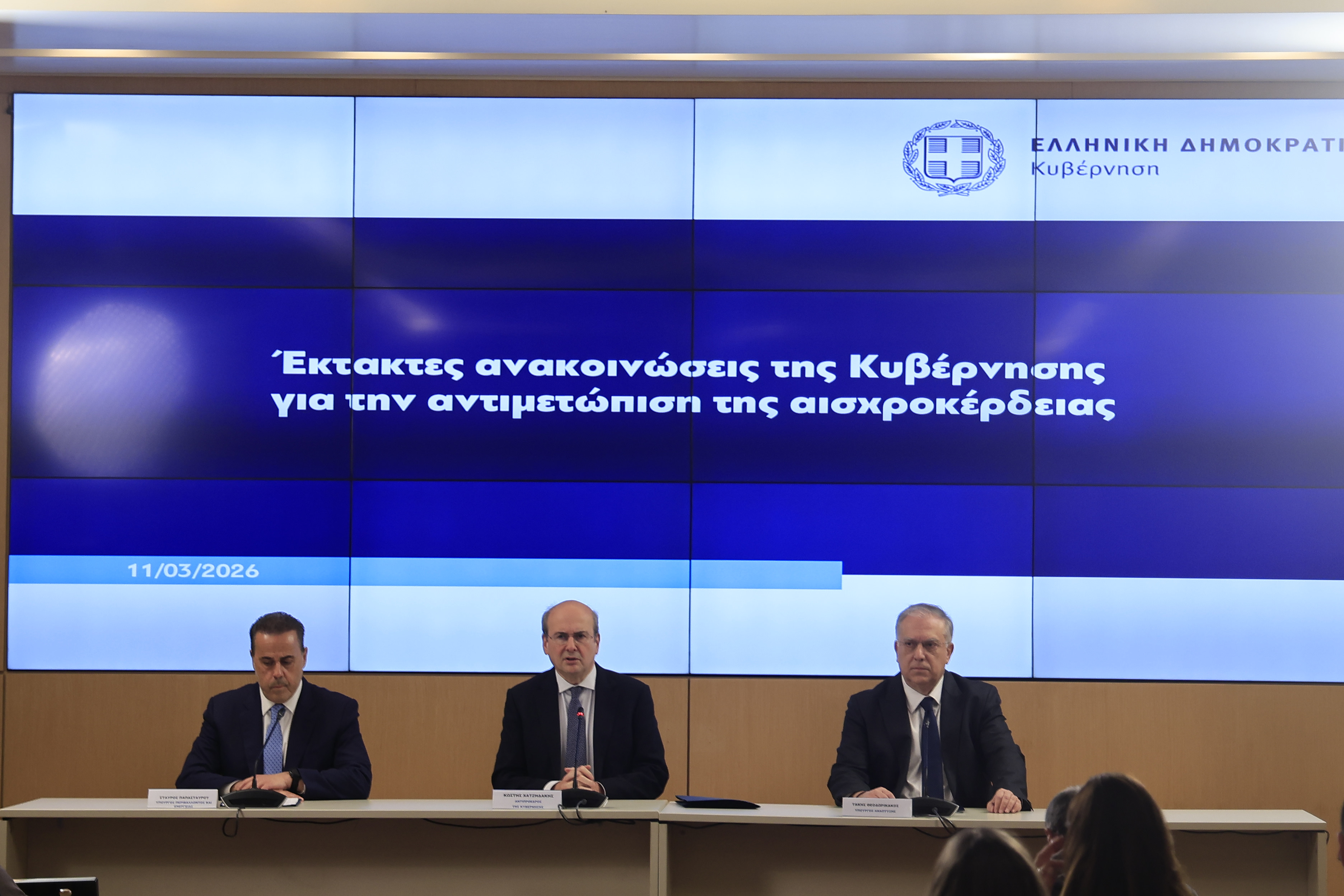 Ο υπουργός Ανάπτυξης Τάκης Θεοδωρικάκος, ο υπουργός Περιβάλλοντος και Ενέργειας Σταύρος Παπασταύρου και ο αντιπρόεδρος της κυβέρνησης Κωστής Χατζηδάκης ανακοίνωσαν τα έκτακτα μέτρα για την ακρίβεια και την αισχροκέρδεια.