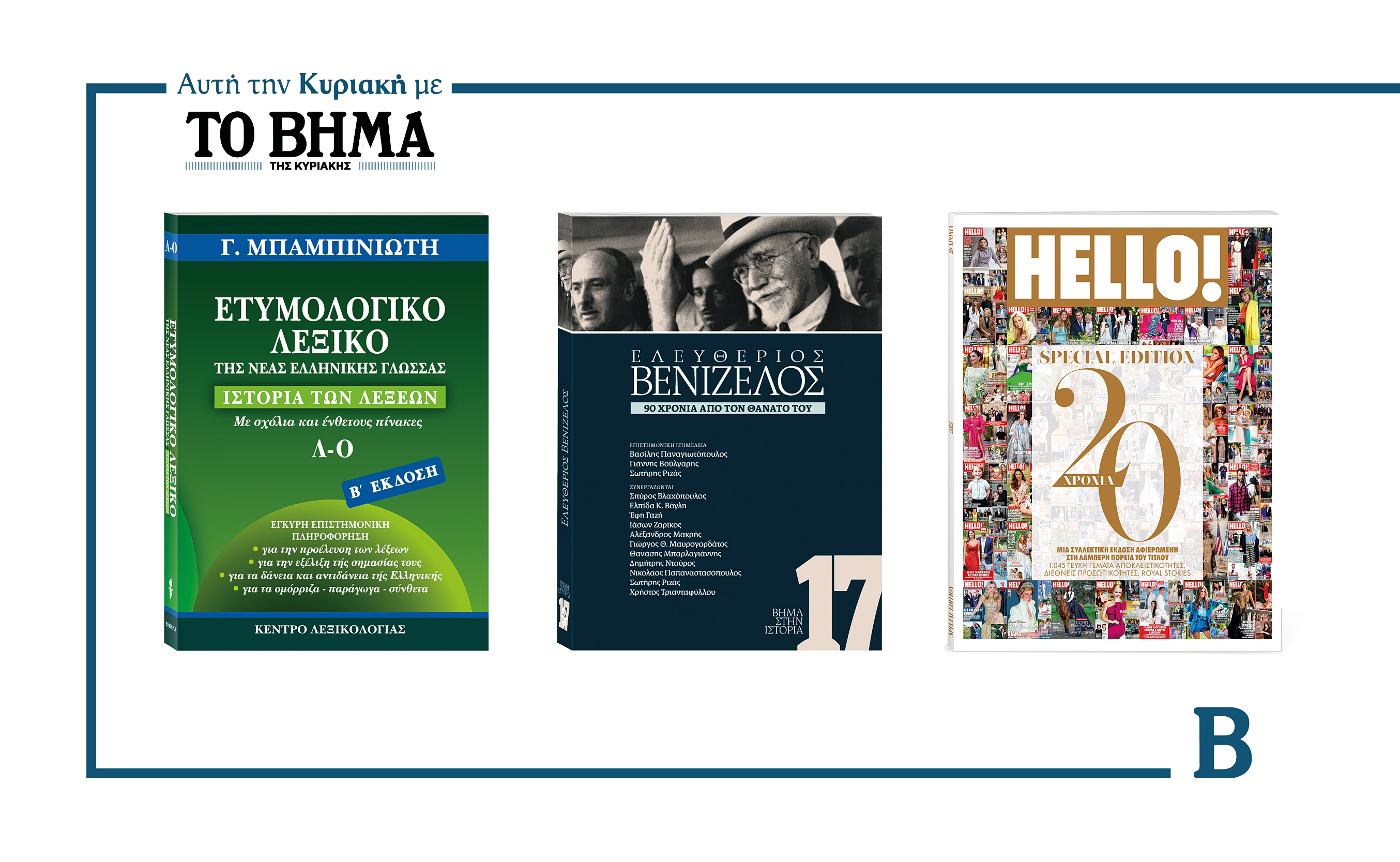 Την Κυριακή 15 Μαρτίου το «Βήμα της Κυριακής» κυκλοφορεί με συναρπαστικές προσφορές: Ο τρίτος τόμος του Ετυμολογικού Λεξικού της Νέας Ελληνικής Γλώσσας του καθηγητή Γεώργιου Μπαμπινιώτη, το Βήμα στην Ιστορία για την ζωή και το έργο του Ελευθέριου Βενιζέλου, το επετειακό τεύχος του HELLO και όπως κάθε Κυριακή, ΒΗΜΑGAZINO.