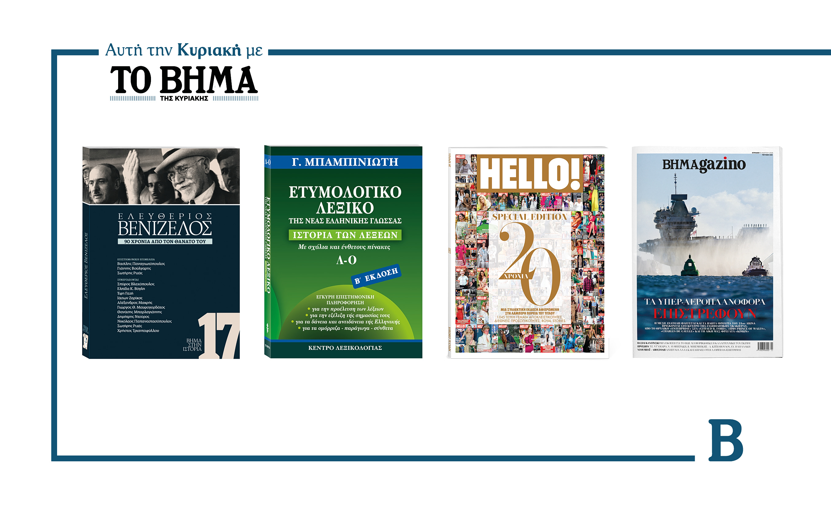 Την Κυριακή 15 Μαρτίου το «Βήμα της Κυριακής» κυκλοφορεί με συναρπαστικές προσφορές: Ο τρίτος τόμος του Ετυμολογικού Λεξικού της Νέας Ελληνικής Γλώσσας του καθηγητή Γεώργιου Μπαμπινιώτη, το Βήμα στην Ιστορία για την ζωή και το έργο του Ελευθέριου Βενιζέλου, το επετειακό τεύχος του HELLO και όπως κάθε Κυριακή, ΒΗΜΑGAZINO.