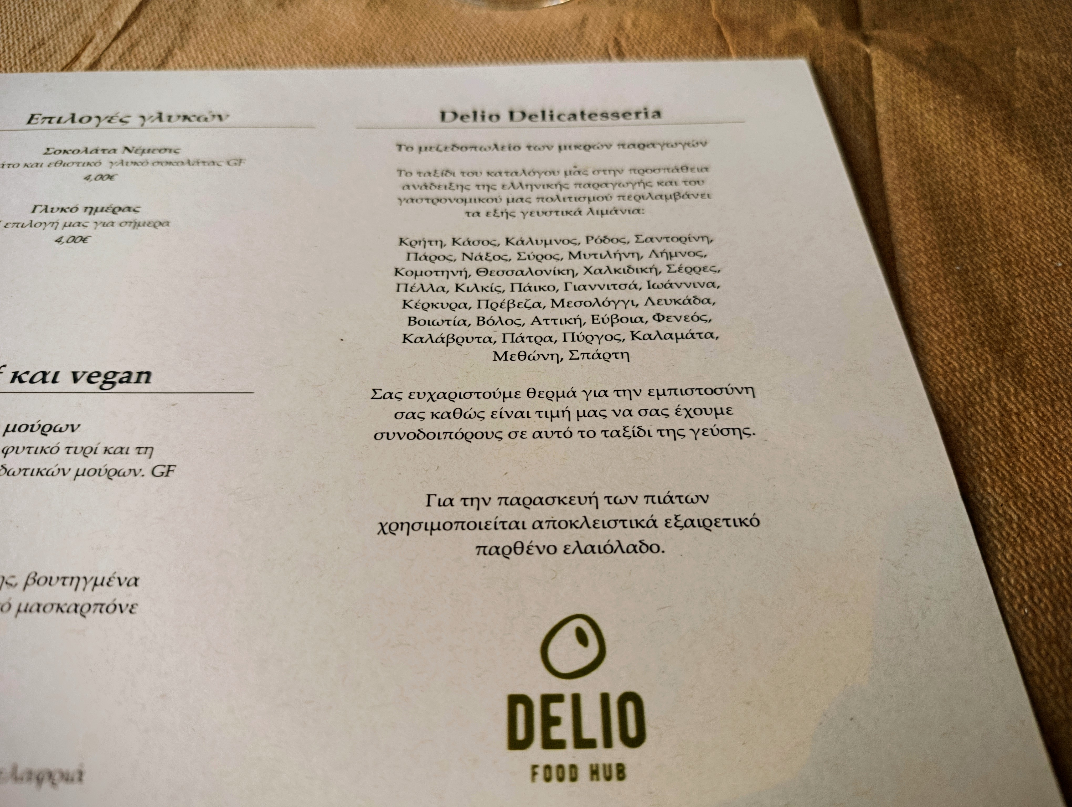 Στο Delio όμως θα βρούμε πιάτα με ονοματεπώνυμο, όπως η φάβα (είτε Σαντορίνης είτε Φενεού, ανάλογα με τη διαθεσιμότητα) παντρεμένη με κρεμμύδια καραμελωμένα με μήλο, ένα τσάτνι που φτιάχνει μια παραγωγός στα Γιάννενα.