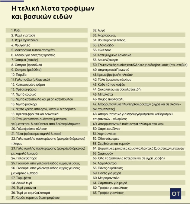 Όπως είχε γράψει και ο ΟΤ, συμπεριελήφθησαν φρέσκα φρούτα και λαχανικά αλλά και προϊόντα προσωπικής υγιεινής στη τελική λίστα, η οποία υπενθυμίζεται ότι μεταξύ άλλων περιλαμβάνει ρύζι, φρυγανιές, αλεύρι για όλες τις χρήσεις, φρέσκα και κατεψυγμένα ψάρια, νωπό κοτόπουλο -μοσχάρι-αρνί-κατσίκι, γάλα φρέσκο πλήρες και με χαμηαλά λιπαρά, τυρί φέτα, γκούντα, ελαιόλαδο, κατεψυγμένα λαχανικά, λευκή ζάχαρη, καφές απορρυπαντικά, σαπούνια, χαρτικά, μαργαρίνες, πάνες για μωρά και τροφές για κατοικίδια.