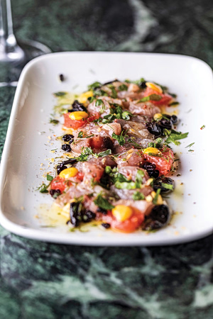 Ελαφρώς μαριναρισμένη παλαμίδα με λούπινα, ελιές και εσπεριδοειδή με τη συνοδεία ενός Queendom