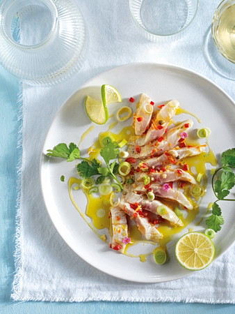- Μόλις ασπρίσουν τα φιλέτα από την οξύτητα, τα κόβουμε λοξά σε λεπτές φέτες και τα σερβίρουμε σε πιάτο. Προσθέτουμε λίγο χυμό εσπεριδοειδών, κόλιαντρο και παρθένο ελαιόλαδο. Γαρνίρουμε με φέτες λάιμ και βρώσιμα λουλούδια για όμορφο χρώμα.