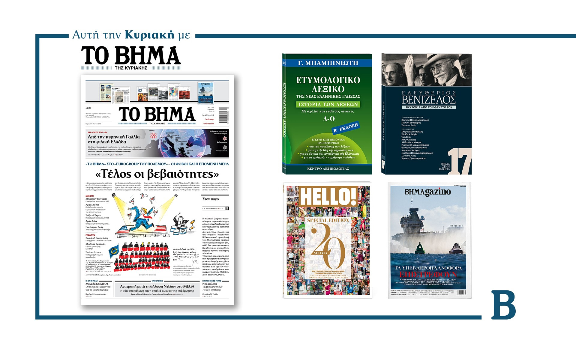 Ο τρίτος τόμος του Ετυμολογικού Λεξικού της Νέας Ελληνικής Γλώσσας του καθηγητή Γεώργιου Μπαμπινιώτη, το Βήμα στην Ιστορία για την ζωή και το έργο του Ελευθέριου Βενιζέλου, το επετειακό τεύχος του HELLO και όπως κάθε Κυριακή, ΒΗΜΑGAZINO.