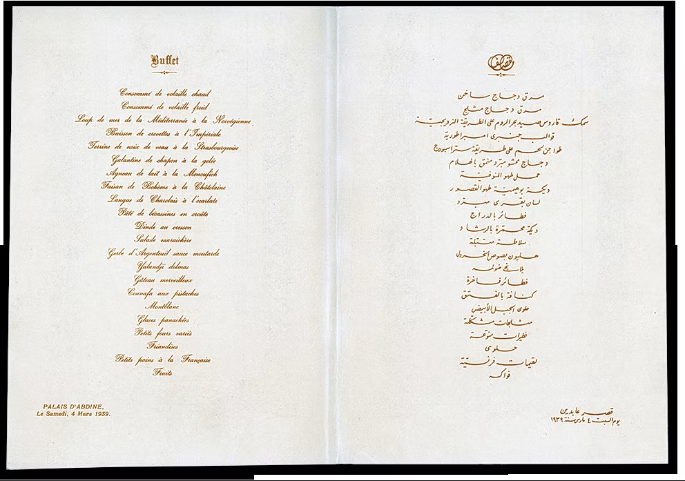 Το μενού εκείνης της βραδιάς, τυπωμένο στα γαλλικά και τα αραβικά, αποτέλεσε μια γαστρονομική προφητεία για το πώς θα κυβερνούσε αργότερα ο Σάχης. Ήταν ένα εκπληκτικό σταυροδρόμι όπου η Μέση Ανατολή συναντούσε την απόλυτη παρισινή πολυτέλεια.