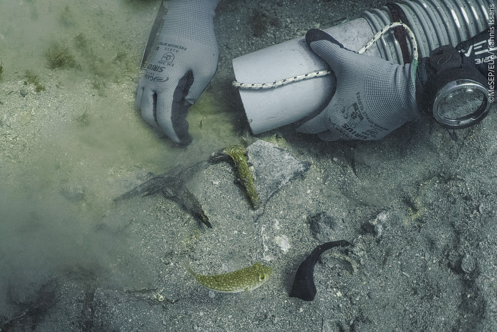 Εικ.. 13 Η μαρμάρινη διακοσμητική σταγόνα κατά χώραν και η ανέλκυσή της από ομάδα δυτών (φωτ. Γ. Ίσσαρης).