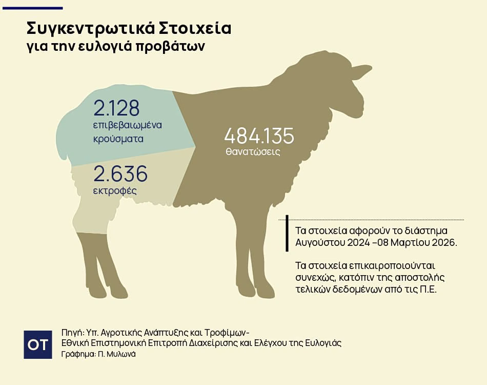 Τα στοιχεία για την επιδημιολογική πορεία της ευλογιάς προβάτων από την εμφάνισή της τον Αύγουστο του 2024 έως και τις 8 Μαρτίου 2026 είναι αποκαλυπτικά: 2.128 επιβεβαιωμένα κρούσματα, 484.135 ζώα έχουν θανατωθεί, ενώ 2.636 εκτροφές έχουν μολυνθεί..
