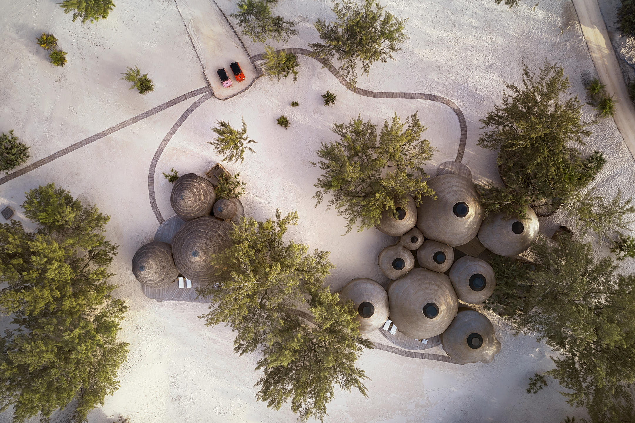 Για την κατασκευή του resort, αντί για τσιμέντο, χρησιμοποιήθηκε ένα ειδικό κονίαμα, φτιαγμένο από την άμμο του ίδιου του νησιού και θαλασσινό νερό.