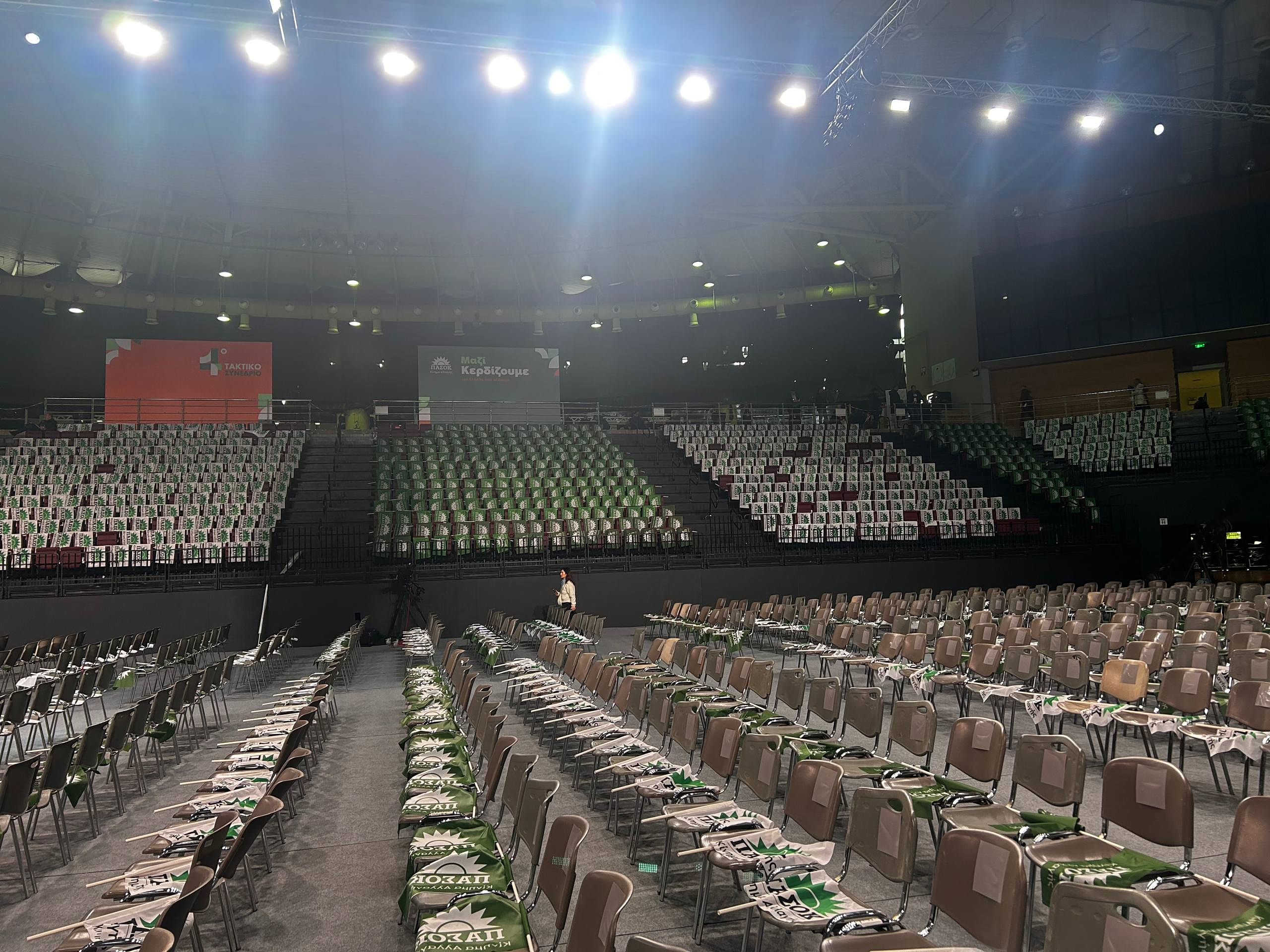 Από νωρίς, τα στελέχη του κόμματος είχαν τοποθετήσει επιμελώς στις καρέκλες του κλειστού γυμναστηρίου του taekwondo, τις σημαίες του κόμματος. Στη μία σειρά ήταν οι πράσινες σημαίες και στην άλλη ήταν οι λευκές. Τις σημαίες αυτές τις βρήκαν οι σύνεδροι, που έφτασαν στο Παλαιό Φάληρο από κάθε γωνιά της χώρας, τις κράτησαν στα χέρια τους και τις ανέμιζαν διαρκώς κατά τη διάρκεια της ομιλίας του Νίκου Ανδρουλάκη. Αποτυπώνοντας με αυτό τον τρόπο τον ζωηρό ρυθμό της συγκέντρωσης. Συνθήματα, χειροκροτήματα και πηγαδάκια μεταξύ συντρόφων που ξεκινούσαν με την ερώτηση «θα είσαι υποψήφιος για Κεντρική Επιτροπή;» συνέθεσαν ένα σκηνικό πολιτικής ζύμωσης.