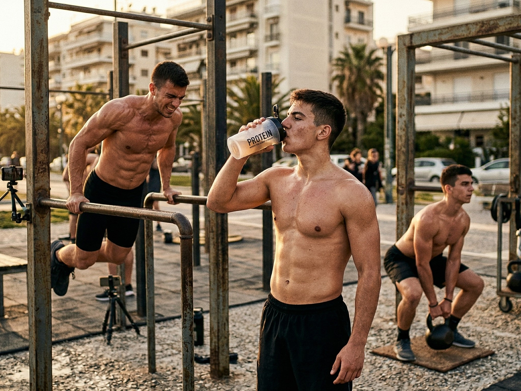 Μια παρέα πέντε εφήβων αγοριών που ακόμη και από απόσταση μοιάζουν ευθυτενή, γυμνασμένα και ρωμαλέα, οδηγούν το φορτωμένο με όλα τα γυμναστηριακά συμπαρομαρτούντα — βάρη, μπάρες, kettlebells, λάστιχα — καρότσι στη μέση του υπαίθριου γυμναστηρίου. Τα ακουμπούν με σχεδόν ιερουργική ευλάβεια στον μαλακό τάπητα, στήνουν τους «σταθμούς» για την ημερήσια προπόνησή τους και ξεκινούν να ιδρώνουν τη φανέλα.