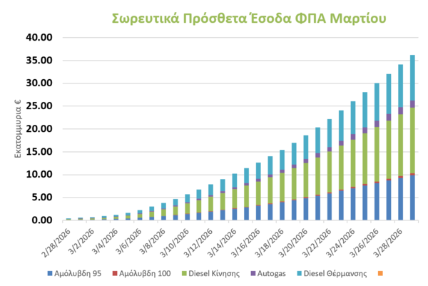Ειδικότερα, τα σωρευτικά πρόσθετα έσοδα ΦΠΑ από τα καύσιμα στις 8 Μαρτίου ήταν λίγο πάνω από 5 εκατ. ευρώ, στις 26 του μήνα άγγιξαν τα 34 εκατ. ευρώ, ενώ για το σύνολο του Μαρτίου σύμφωνα με εκτίμηση ξεπέρασαν τα 36 εκατ. ευρώ.