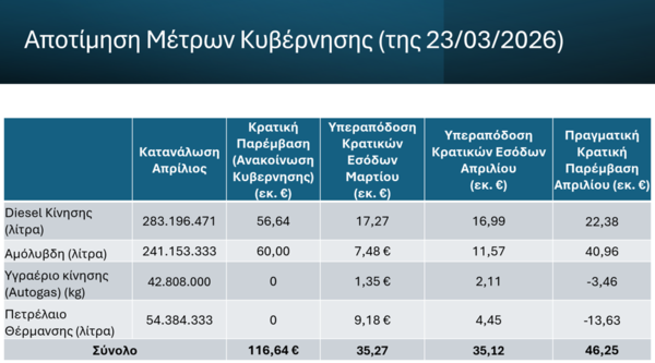 Παράλληλα, η συνολική παρέμβαση της κυβέρνησης για τον μήνα Απρίλιο ανέρχεται σε 116 εκατ. ευρώ, όμως την ίδια περίοδο καταγράφει αυξημένα έσοδα από τον ΦΠΑ, λόγω της σημαντικής ανόδου των τιμών, και με βάση τα έως τώρα διαθέσιμα στοιχεία τα εν λόγω πρόσθετα έσοδα ξεπερνούν τα 70 εκατ. ευρώ. Ως εκ τούτου η καθαρή δημοσιονομική παρέμβαση δεν ανέρχεται σε 116 εκατ. ευρώ αλλά περιορίζεται σε περίπου 46 εκατ. ευρώ.