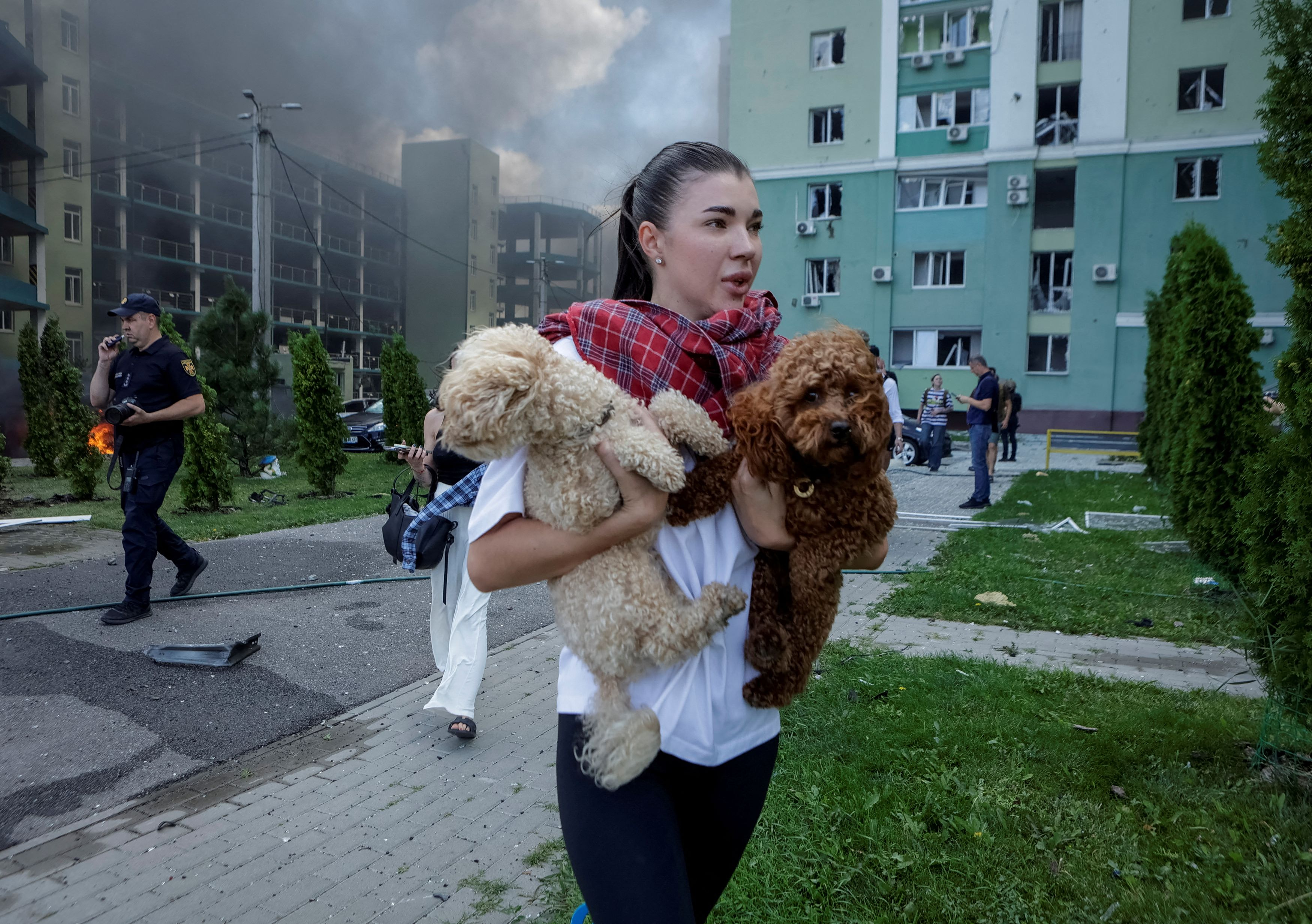 Ταυτοχρόνως, πολλοί από τους πρόσφυγες, που αναγκάστηκαν να εγκαταλείψουν αιφνιδίως τις οικίες τους, ιδίως κατά τους πρώτους μήνες της ρωσικής εισβολής, δεν μπόρεσαν να πάρουν μαζί τους τα κατοικίδια σκυλιά τους, με αποτέλεσμα αυτά να μείνουν αδέσποτα σε ένα ιδιαιτέρως αντίξοο περιβάλλον. Οι σκύλοι αναγκάζονται να ακολουθήσουν μια άγρια ζωή και να βρουν την τροφή τους ως τροφοσυλλέκτες και περιστασιακοί κυνηγοί ή, στην πιο μακάβρια περίπτωση, να σκυλεύσουν νεκρούς στρατιώτες, που έχουν παραμείνει άταφοι λόγω πληγμάτων drones ή βλημάτων.