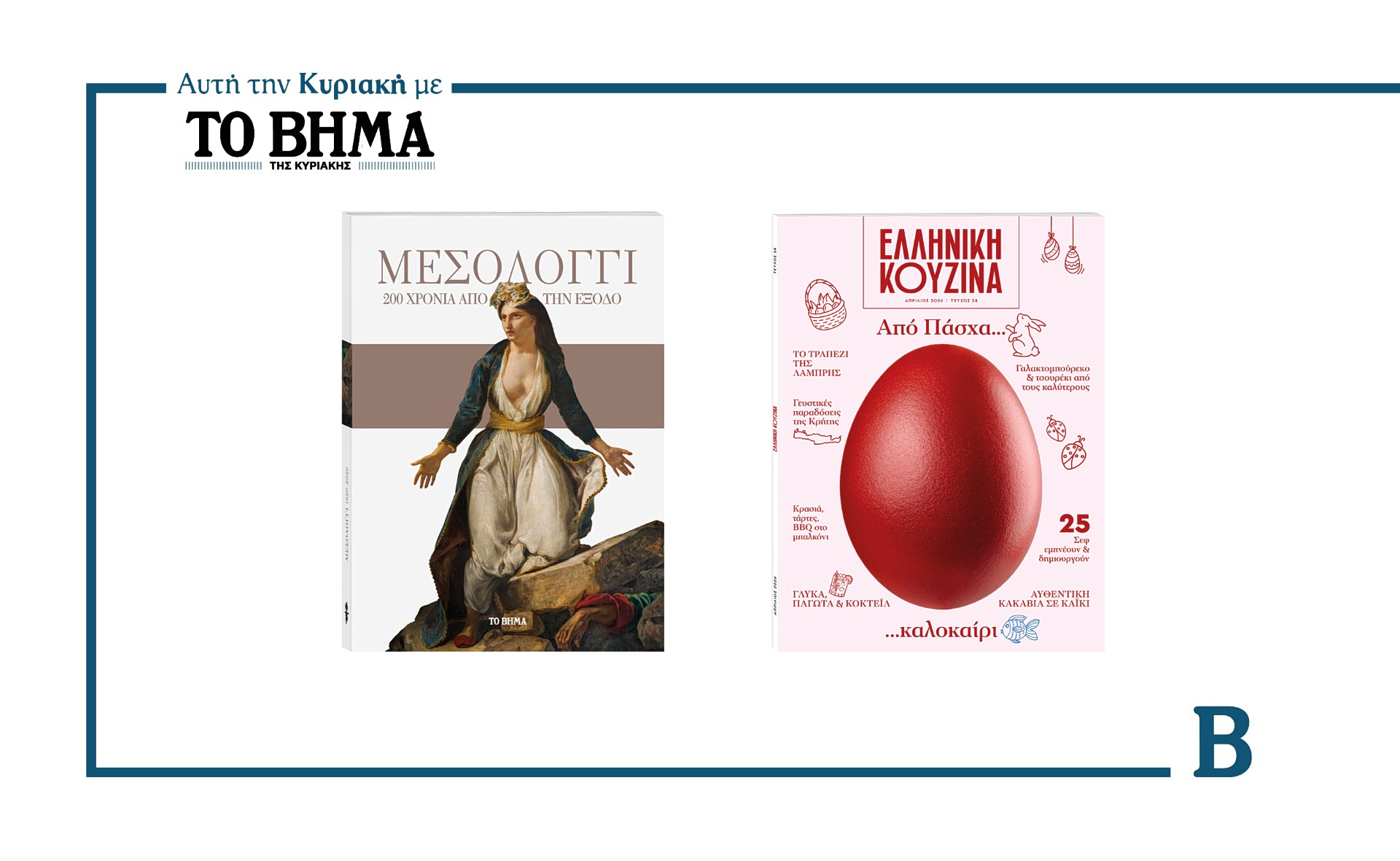 Την Κυριακή 5 Απριλίου το «Βήμα της Κυριακής» κυκλοφορεί με συναρπαστικές προσφορές: Την συλλεκτική έκδοση «Μεσολόγγι: 200 χρόνια από την Έξοδο», την Ελληνική Κουζίνα και όπως κάθε Κυριακή, ΒΗΜΑGAZINO.