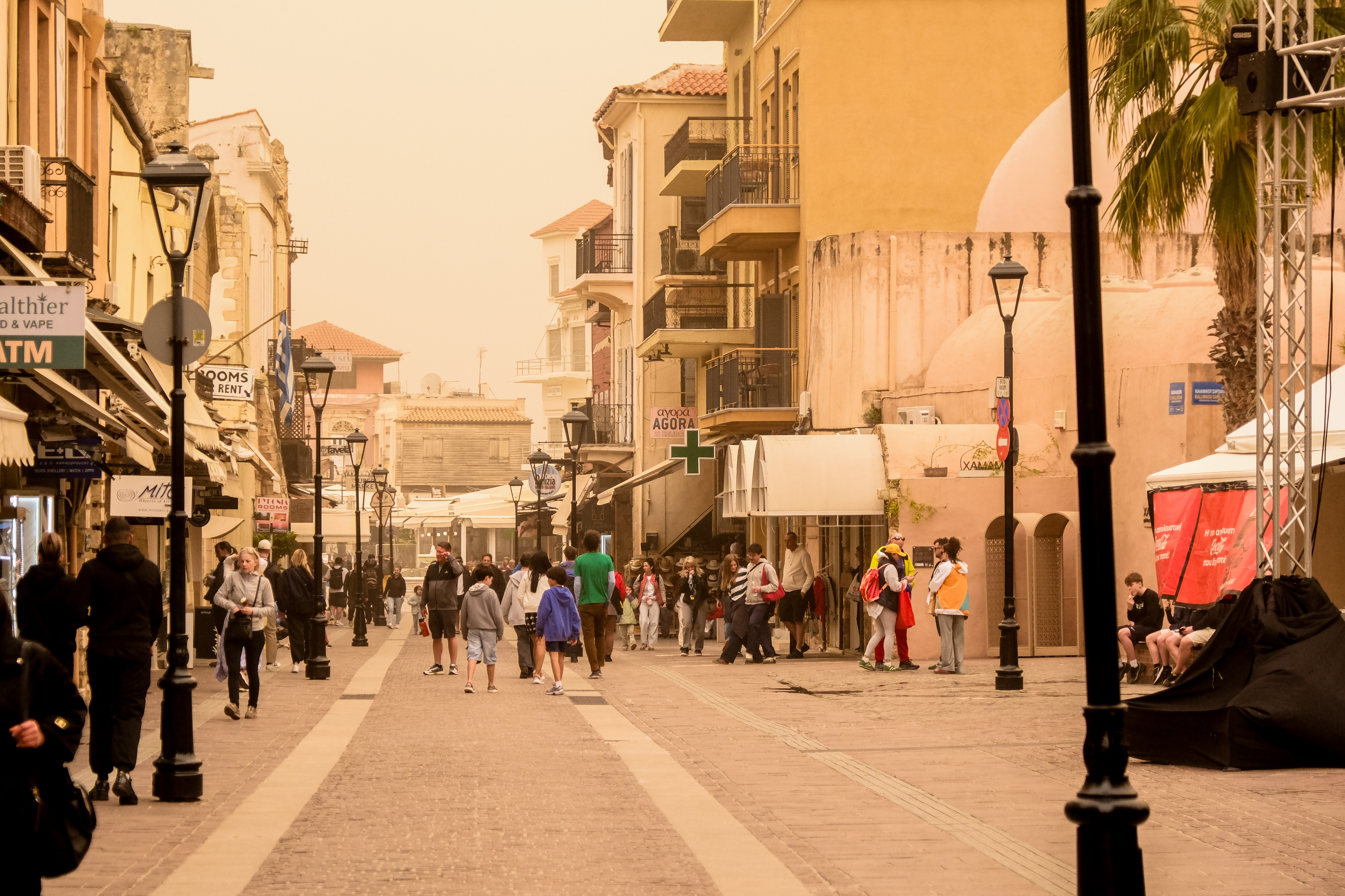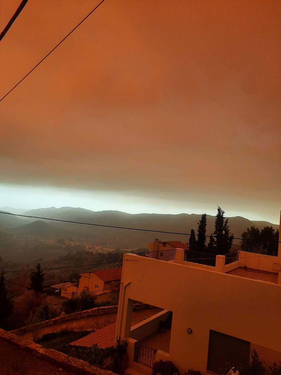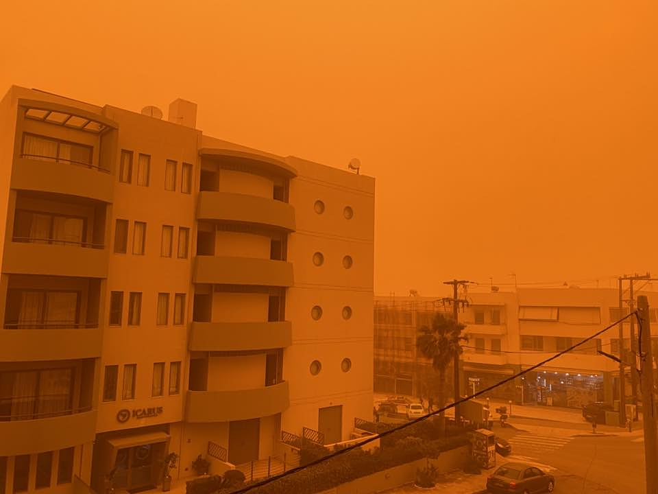 Απόκοσμες είναι οι εικόνες που έρχονται από την Κρήτη, όπου η αφρικανική σκόνη έχει καλύψει σχεδόν τα πάντα δίνοντας στον ουρανό ένα βαθύ πορτοκαλί χρώμα.