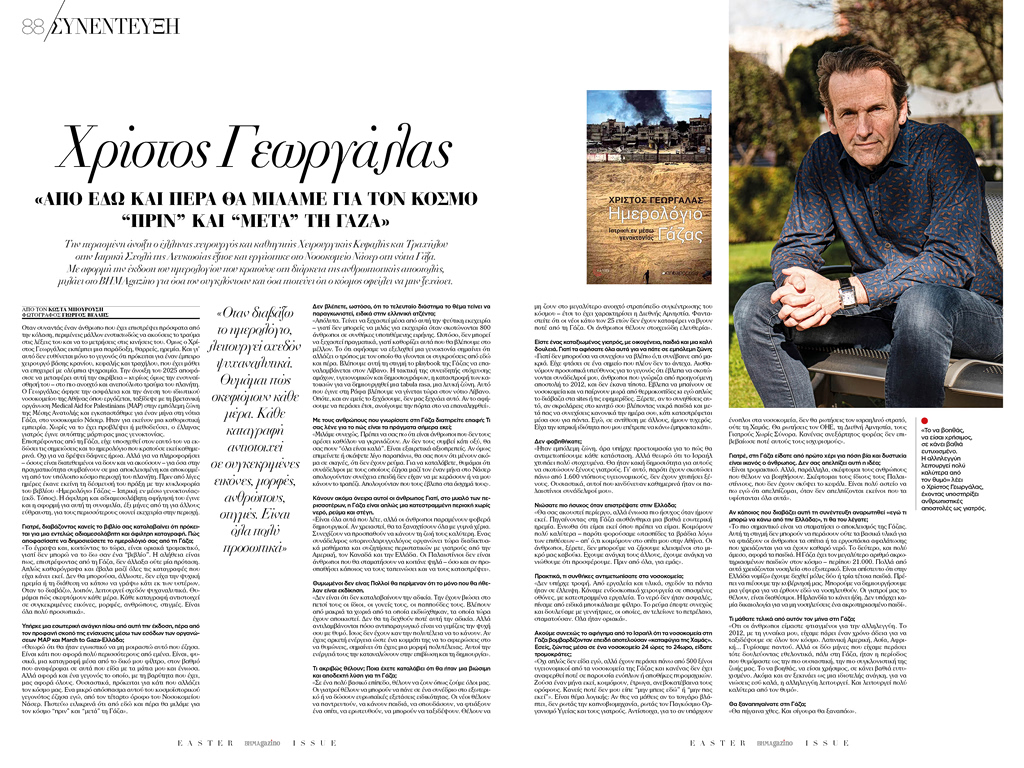 Ιδιαίτερη θέση στο τεύχος κατέχει η συγκλονιστική μαρτυρία του χειρουργού Χρίστου Γεωργάλα, ο οποίος εργάστηκε στο Νοσοκομείο Νάσερ στη νότια Γάζα. Μέσα από το ημερολόγιό του και τη συνέντευξή του στο BHMAGAZINO, αναδεικνύονται στιγμές που δεν πρέπει να ξεχαστούν, σε μια εποχή όπου η ανθρώπινη αντοχή δοκιμάζεται καθημερινά. Στο ίδιο πνεύμα, ένα εκτενές ρεπορτάζ της Βελίκας Καραβάλτσιου από τον Λίβανο καταγράφει τη ζωή στη σκιά του πολέμου, αλλά και την επιμονή της ελπίδας.