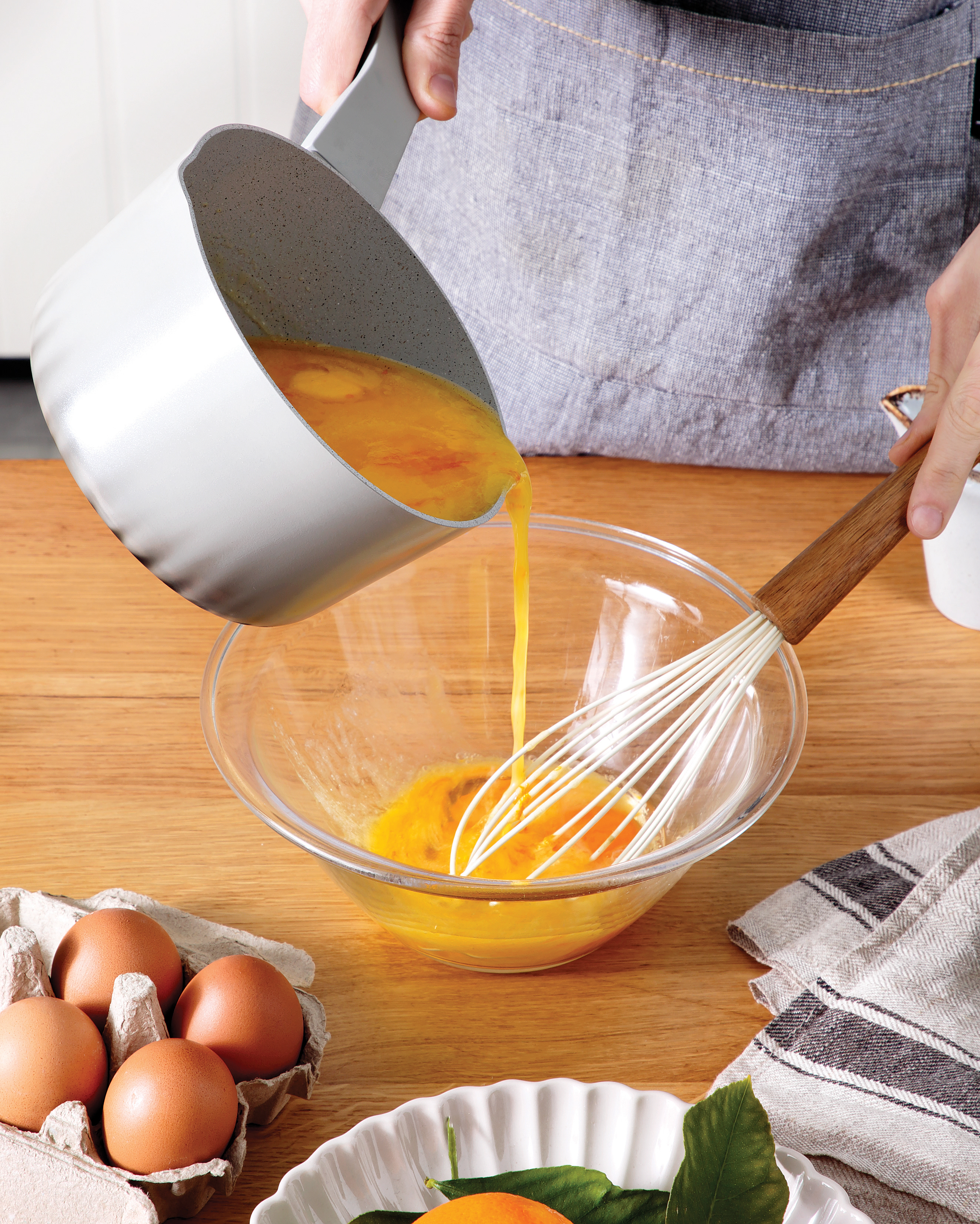 Ανακατεύουμε σε ένα άλλο μπολ με σύρμα τα αβγά και ταυτόχρονα ενσωματώνουμε το μείγμα γάλακτος-βουτύρου με προσοχή και σταδιακά για να μην ψηθούν τα αβγά.