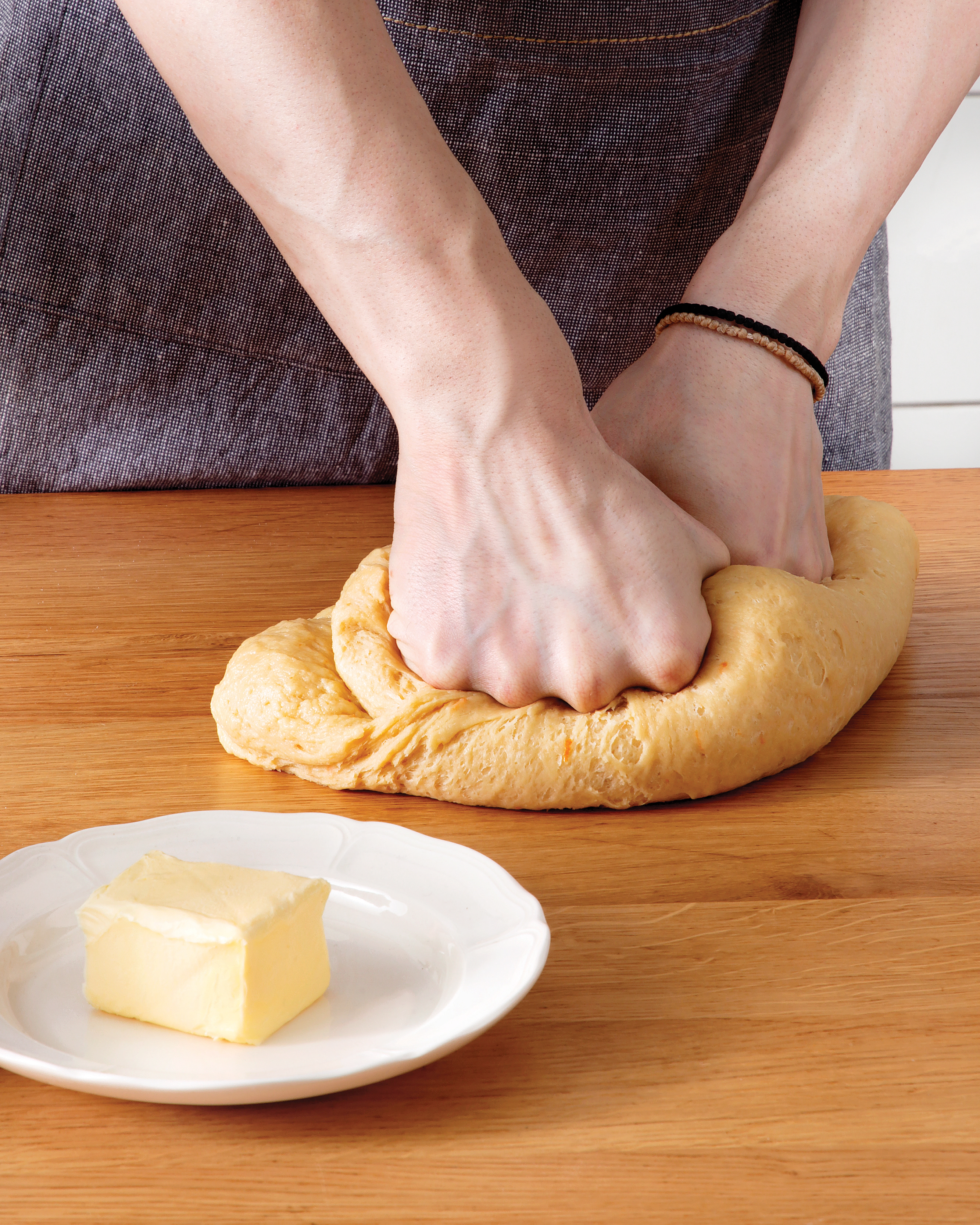 Όταν αρχίσει να σχηματίζεται μια ζύμη, ενσωματώνουμε το βούτυρο, σταδιακά, σε κύβους, δουλεύοντας το μίξερ σε μέτρια προς δυνατή ταχύτητα. Χτυπάμε για συνολικά 10 λεπτά, μέχρι να αποκτήσουμε μια απαλή και αφράτη ζύμη που να ξεκολλάει εντελώς από τα τοιχώματα του κάδου.