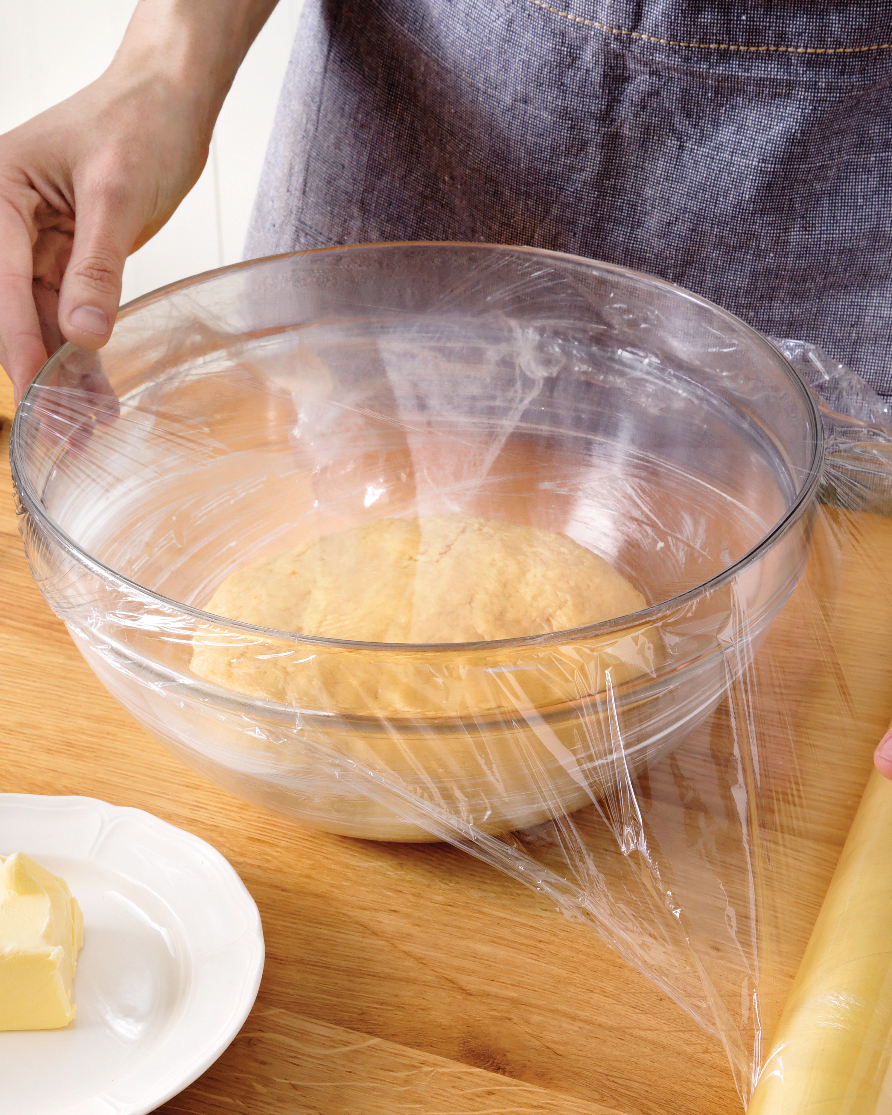 Μεταφέρουμε τη ζύμη σε βουτυρωμένο μπολ, τη σκεπάζουμε με μεμβράνη ώστε να μην παίρνει αέρα από πουθενά και την αφήνουμε να φουσκώσει για περίπου 8-10 ώρες σε θερμοκρασία δωματίου.