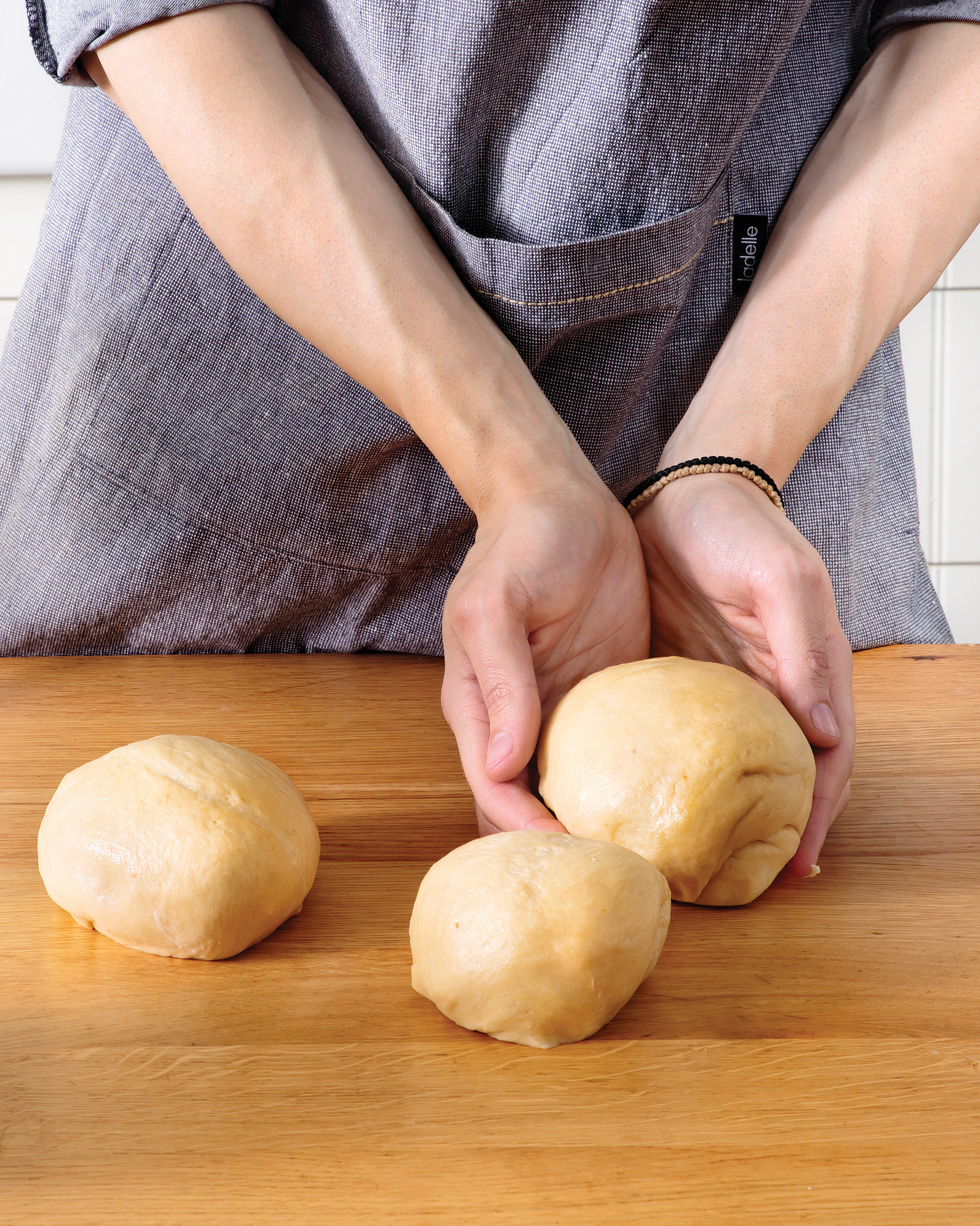 6 Όταν φουσκώσει καλά η ζύμη, τη βγάζουμε από το μπολ και την ξεφουσκώνουμε. Στη συνέχεια, τη χωρίζουμε σε τρία ίσα μέρη για να φτιάξουμε ισάριθμα τσουρέκια.