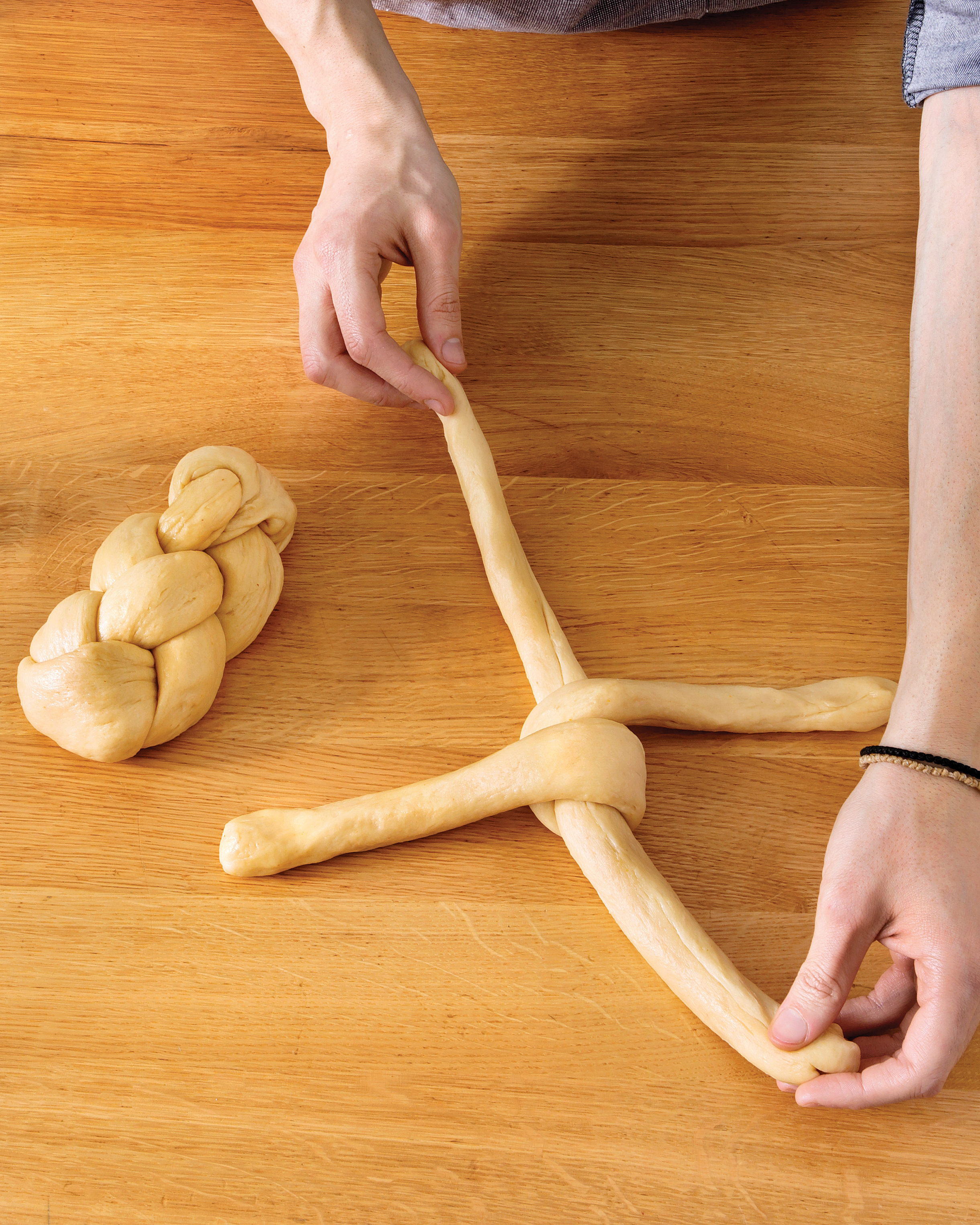 7 Πλάθουμε το κάθε κομμάτι σε δύο φιτίλια, τα οποία πλέκουμε σταυρωτά φτιάχνοντας τσουρέκια. Βάζουμε τα τσουρέκια σε δύο ταψιά με αντικολλητικό χαρτί, τα σκεπάζουμε με πετσέτα και τα αφήνουμε μία με δύο ώρες, να διπλασιαστούν σε όγκο.