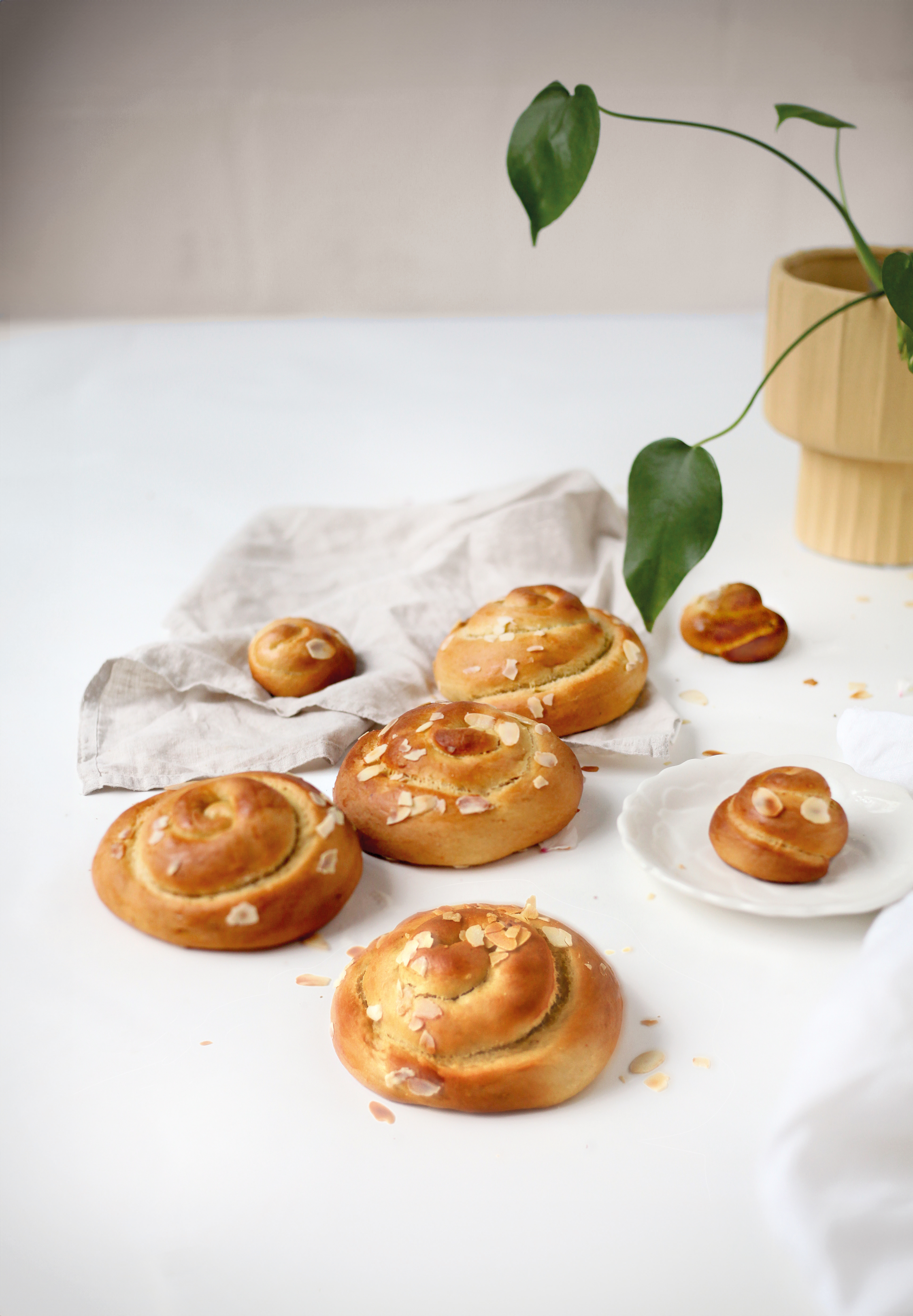 Ανοίγουμε κάθε μπαλάκι σε φιτίλι και το τυλίγουμε σαν σαλιγκάρι. Ιδανικά, μπορούμε να χωρίσουμε τη ζύμη σε ακόμα μικρότερα μέρη και να τα βάλουμε σε μικρές στρογγυλές φόρμες, ώστε, όσο ψήνονται, να διατηρούν το αρχικό σχήμα τους. Τα σκεπάζουμε με μια πετσέτα ώστε να μην παίρνουν αέρα και ξεραθούν και τα αφήνουμε να φουσκώσουν σε θερμοκρασία δωματίου μέχρι να διπλασιαστούν σε όγκο.