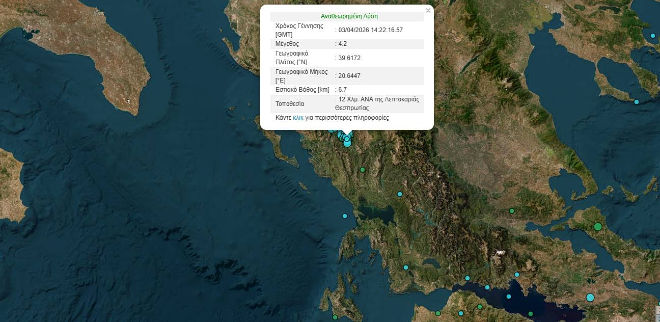 Νέα σεισμική δόνηση σημειώθηκε στις 17:22:17 ώρα Ελλάδας στη Θεσπρωτία, με μέγεθος 4,2 βαθμών της κλίμακας Ρίχτερ και εστιακό βάθος 6,7 χιλιομέτρων, σύμφωνα με την αναθεωρημένη λύση του Γεωδυναμικού Ινστιτούτου του Εθνικού Αστεροσκοπείου Αθηνών.