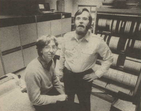 «Το 1981, στην Ουάσιγκτον, οι νεαροί τότε ιδρυτές της εταιρείας Microsoft, Μπιλ Γκέιτς (αριστερά στη φωτογραφία) και Πολ Άλεν (δεξιά), φωτογραφίζονται στα τότε μικρά γραφεία της επιχείρησής τους στο Μπελβί της Ουάσιγκτον. Πίσω τους διακρίνονται μεγάλοι προσωπικοί υπολογιστές σε μέγεθος ψυγείου και ράφια με μπομπίνες μαγνητοταινιών.