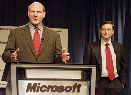 Οι Μπάλμερ και Γκέιτς σε συνέντευξη Τύπου το 2001. Ο Μπάλμερ πήρε τη σκυτάλη όταν ο Γκέιτς αποχώρησε από τη θέση του CEO.