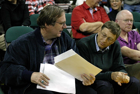 Ο Πολ Άλεν και ο Μπιλ Γκέιτς σε αγώνα NBA στο Σιάτλ το 2004, σε μια σπάνια κοινή δημόσια εμφάνιση, χρόνια μετά την αποχώρηση του Άλεν από τη Microsoft το 1983, για λόγους υγείας.