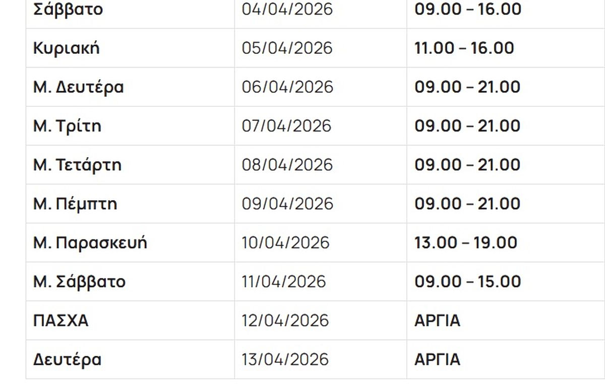 - Τη Μεγάλη Παρασκευή 10/4, τα καταστήματα θα λειτουργήσουν από τις 13:00 έως τις 19:00, ενώ το Μεγάλο Σάββατο 1/4 από τις 10:00 έως τις 16:00.