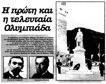 «Tην Κυριακή του Πάσχα, 24 Μαρτίου 1896, υπό καταρρακτώδη βροχή, έγιναν στο προαύλιο του Σταδίου τα αποκαλυπτήρια του ανδριάντα του Γεωργίου Αβέρωφ. Χάρη στη γενναία χορηγία του για την αναστήλωση του κατεστραμμένου αρχαίου Σταδίου, το όνειρο της αναβίωσης των Ολυμπιακών Αγώνων γινόταν πραγματικότητα».
