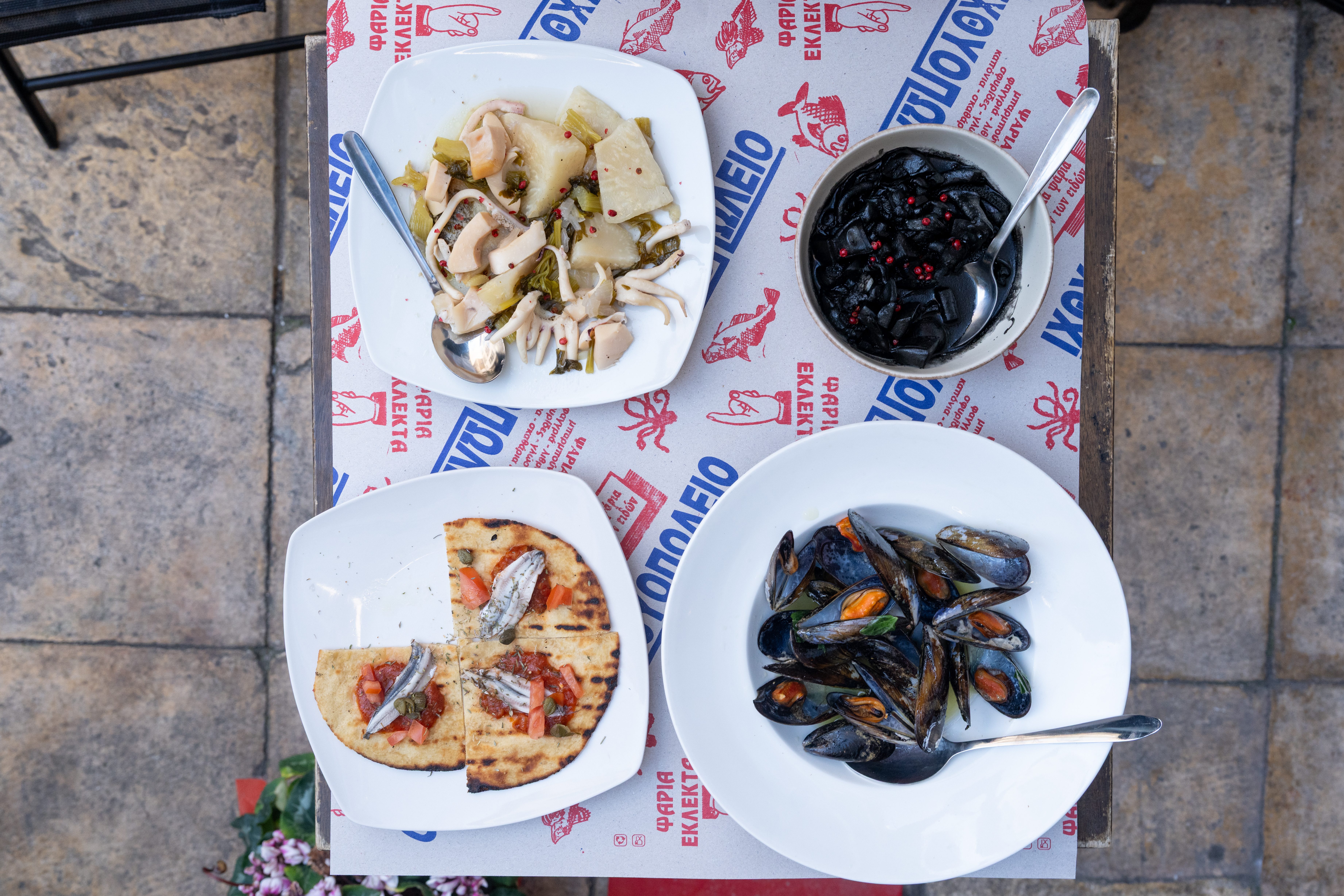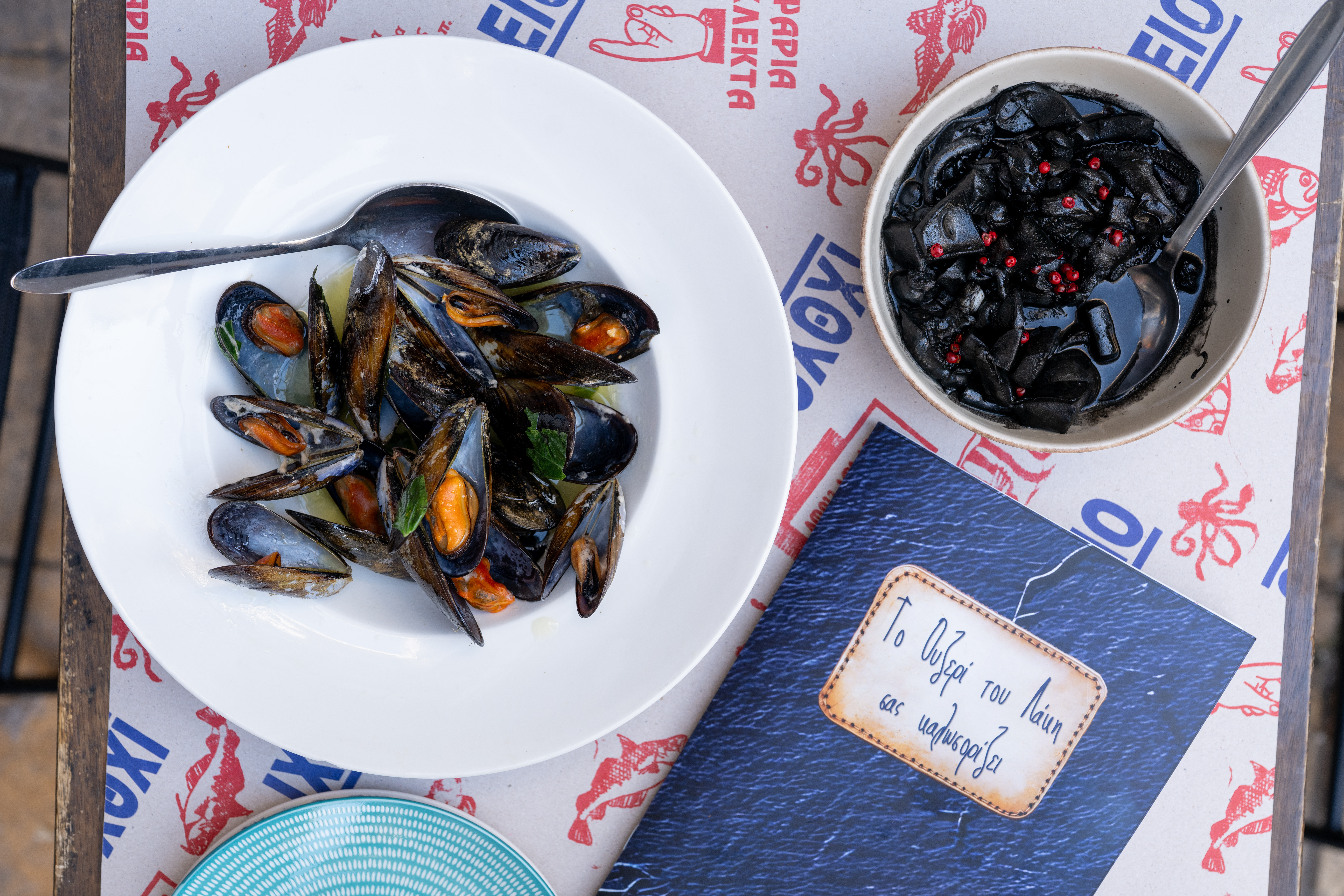Σουπιές με σέλινο ή με το μελάνι τους, λαδένια με μαριναρισμένο γαύρο και πικάντικη σάλτσα και φανταστικά αχνιστά μύδια στο τραπέζι μας. Φωτό: Αλέξανδρος Αλεξανδρής
