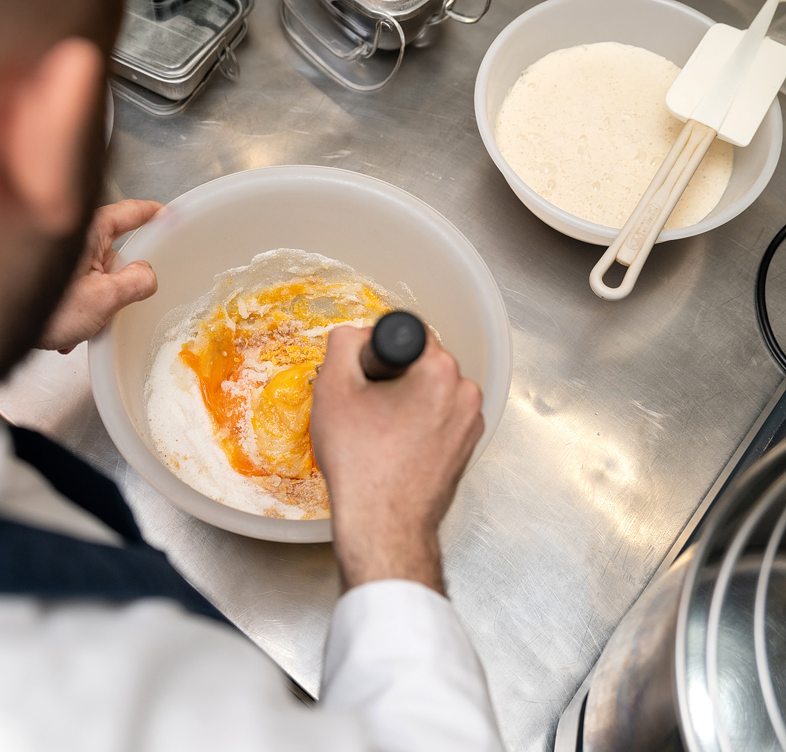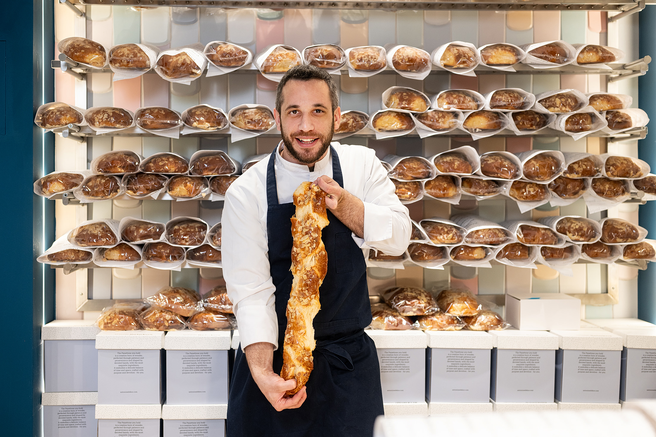 Στο ζαχαροπλαστείο του στο Παγκράτι, όπου το πανετόνε έχει γίνει σημείο αναφοράς, τίποτα δεν παράγεται μαζικά. Οι ποσότητες είναι ελεγχόμενες, η διαδικασία ξεκινά πάντα από εκείνον, τα υλικά επιλέγονται με απίστευτη προσοχή και μετά από μελέτη.