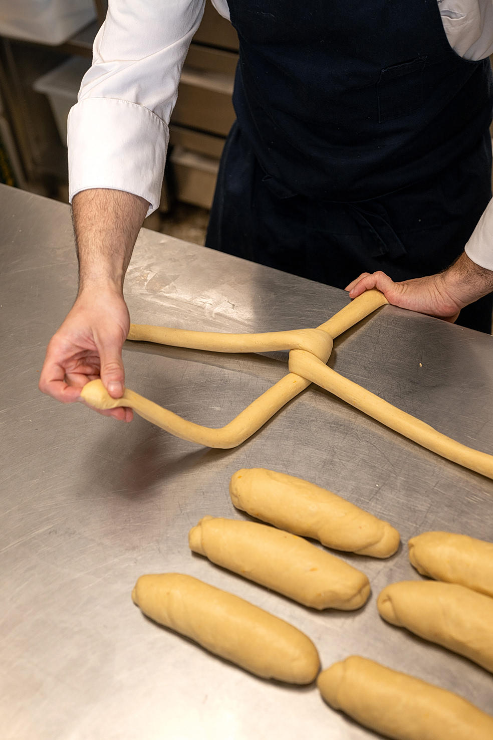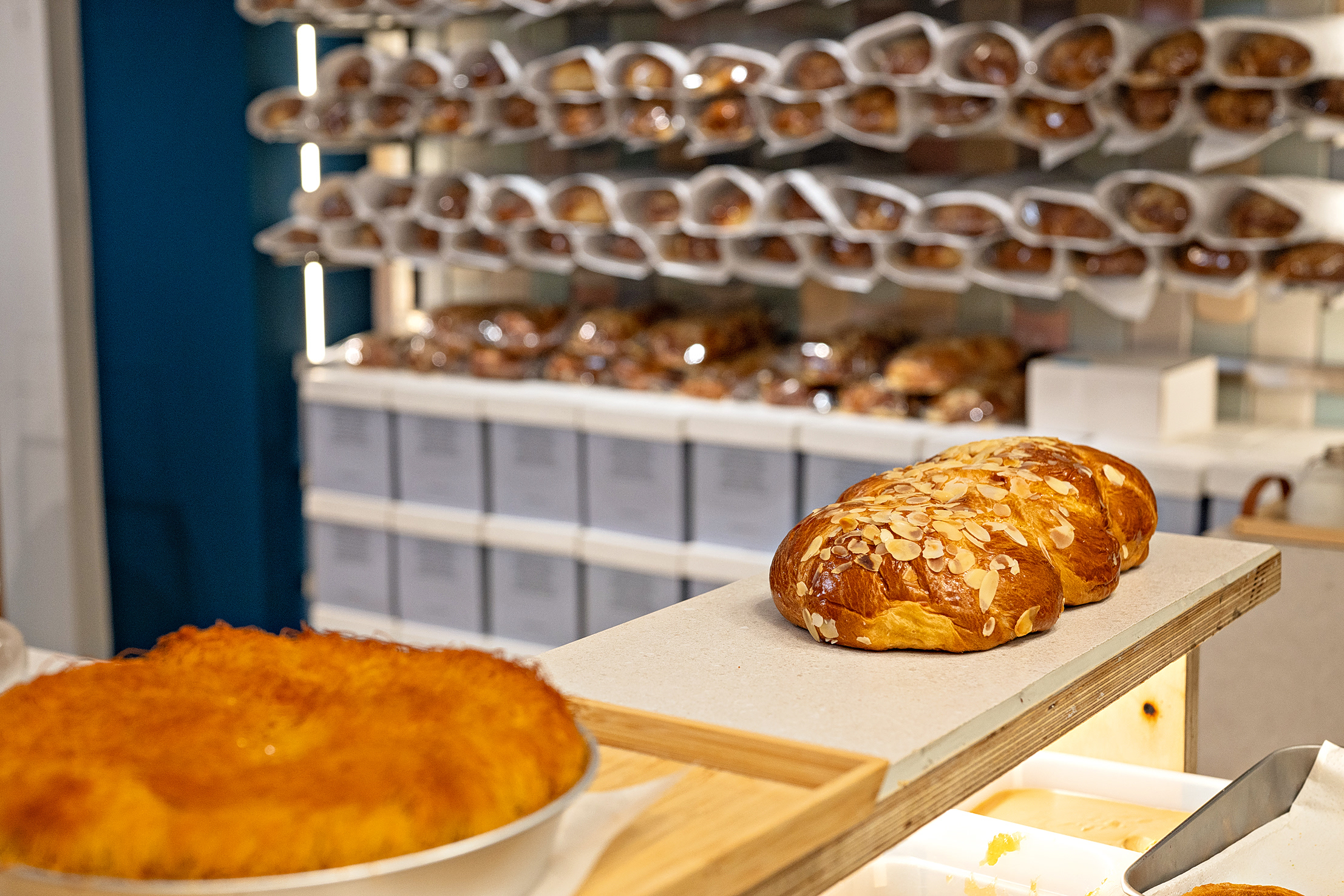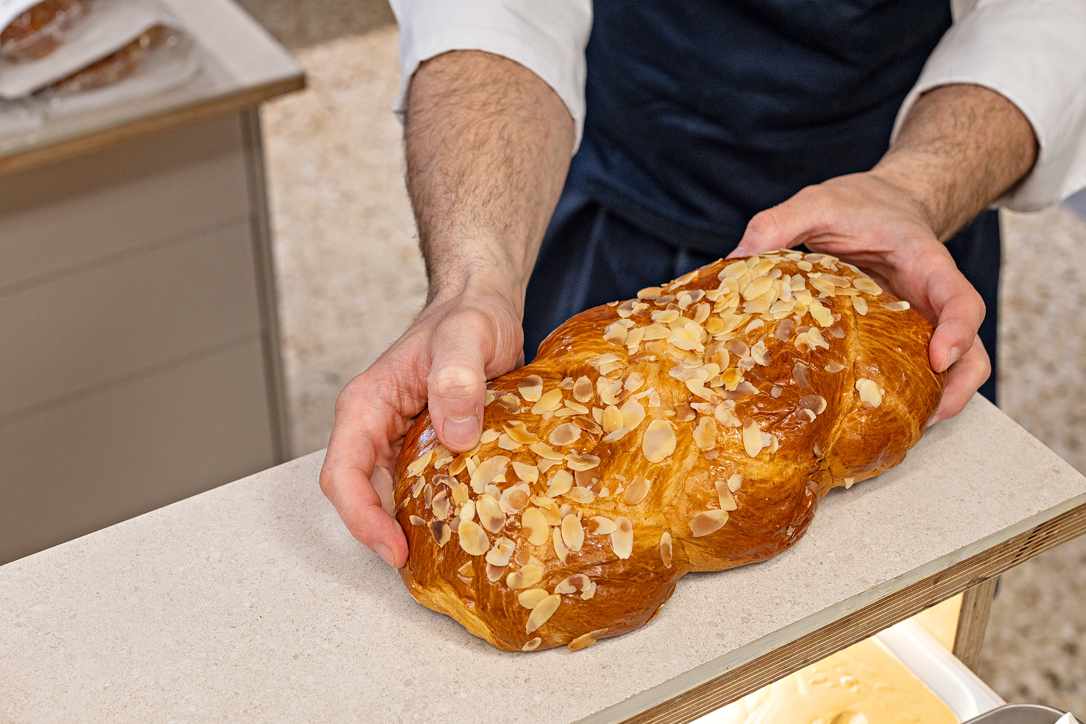 Και κάπου εκεί, μέσα σε αυτήν τη φαινομενική «ηρεμία», βρίσκει πάντα χρόνο να σκέφτεται και να δημιουργεί παραλλαγές. Το τσουρέκι του δεν είναι ένα. Είναι μια βάση που εξελίσσεται διακριτικά: από την κλασική εκδοχή με έντονη μαστίχα, δουλεμένη πλέον με καθαρό μαστιχέλαιο από παραγωγούς της Χίου, μέχρι πιο σύγχρονες εκδοχές που παίζουν με τα αρώματα και τις εντάσεις. Στις γεμίσεις, κρατά δύο σταθερές επιλογές που λειτουργούν σχεδόν σαν υπογραφή: πραλίνα φουντουκιού και πραλίνα φιστικιού. Παράλληλα, στο παρασκήνιο, συνεχίζονται οι δοκιμές: εσπεριδοειδή όπως μανταρίνι και περγαμόντο, συνδυασμοί με μπαχαρικά, ιδέες που προς το παρόν μένουν στο εργαστήριο, μέχρι να είναι έτοιμες να βγουν προς τα έξω.