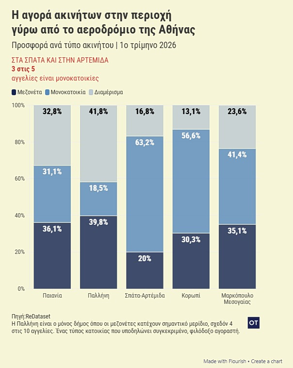 Η διαφορά είναι χαώδης: Η απόκτηση κατοικίας στην Παλλήνη κοστίζει πάνω από 1.000 ευρώ ανά τ.μ. επιπλέον σε σχέση με τα Σπάτα ή την Αρτέμιδα, παρόλο που οι δύο δήμοι συνορεύουν και εξυπηρετούνται από τον ίδιο συγκοινωνιακό κόμβο. Η διαφορά δεν εντοπίζεται μόνο στο κόστος, αλλά και στον χαρακτήρα των ακινήτων. Στα Σπάτα και την Αρτέμιδα, η αγορά κυριαρχείται από μονοκατοικίες, προσφέροντας ένα προϊόν που απευθύνεται σε όσους αναζητούν περισσότερο χώρο σε χαμηλότερο κόστος.