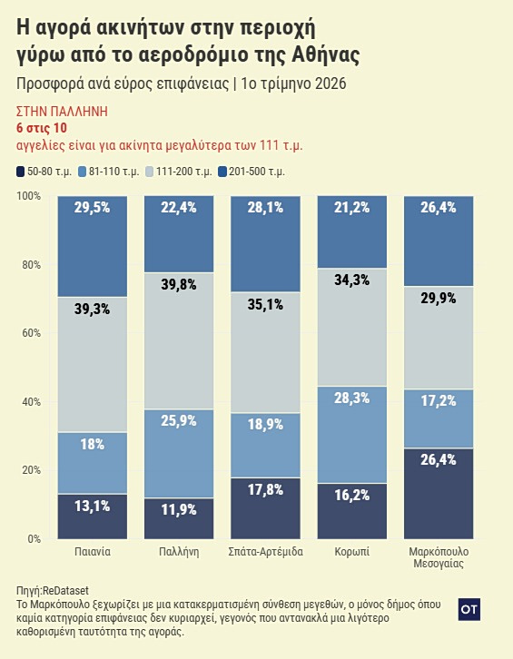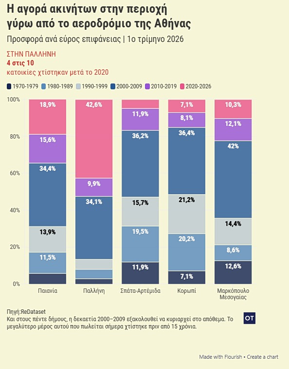 Στον αντίποδα, η Παλλήνη έχει μετατραπεί σε ένα σύγχρονο οικιστικό κέντρο. Ένα πολύ μεγάλο ποσοστό των διαθέσιμων κατοικιών εκεί έχει κατασκευαστεί μετά το 2020, την ώρα που η οικοδομική δραστηριότητα στην υπόλοιπη ζώνη του αεροδρομίου παρέμενε σχεδόν στάσιμη. Σε μια περίοδο που το ενεργειακό κόστος καθορίζει τις αποφάσεις των αγοραστών, η Παλλήνη παίρνει σαφές προβάδισμα. Διαθέτει σχεδόν το διπλάσιο απόθεμα ακινήτων υψηλής ενεργειακής κλάσης σε σύγκριση με το Κορωπί.