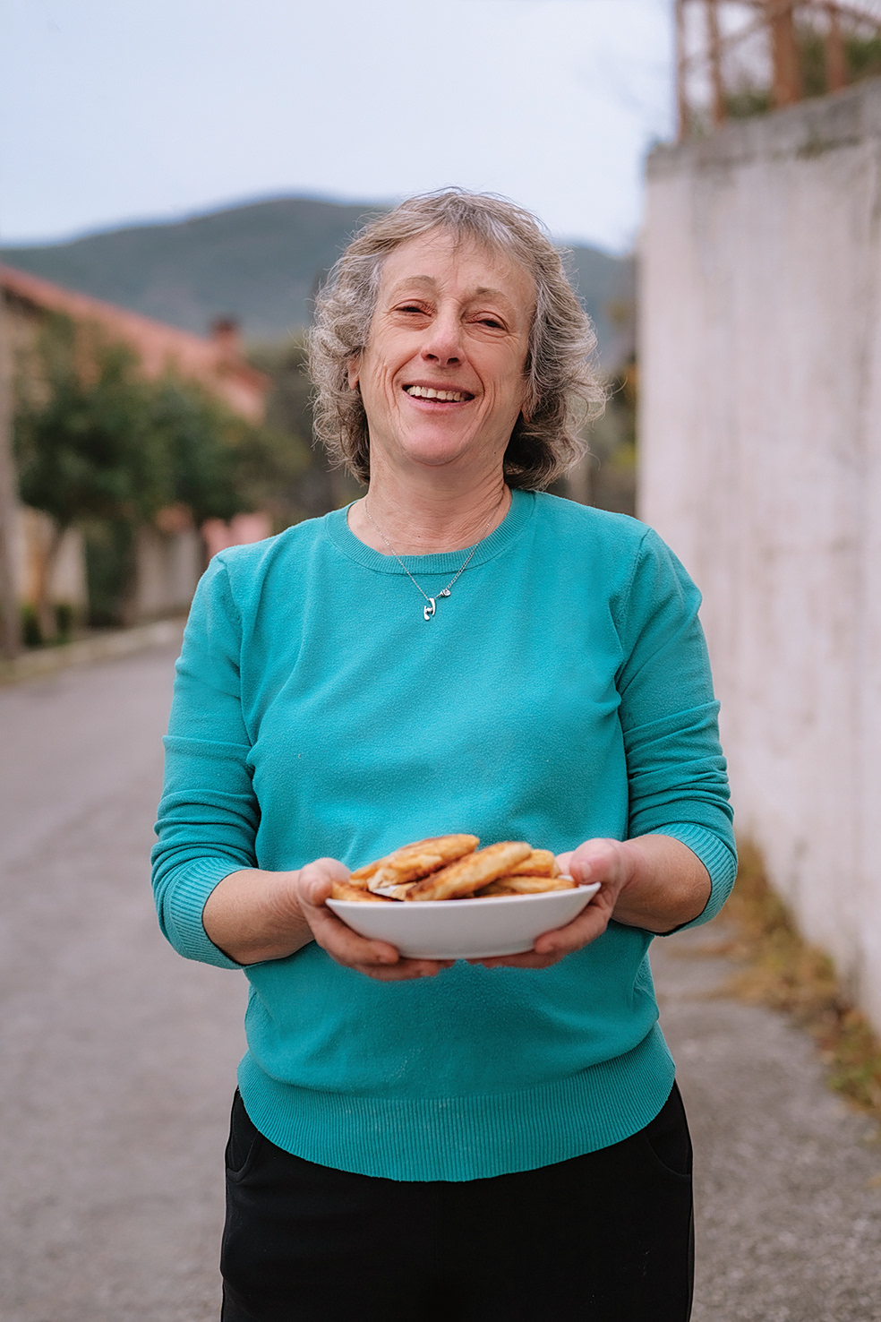 Η Άννα Μπαλαντινάκη στα Μεσκλά μας έφτιαξε κρεατόπιτα με τη βοήθεια της Ελένης Μανωλαράκη από τον Πολιτιστικό Σύλλογο του χωριού. Μαζί μας η κόρη της Άννας, η γλυκιά Εμμανουέλλα. Φωτό: Αλέξανδρος Αλεξανδρής