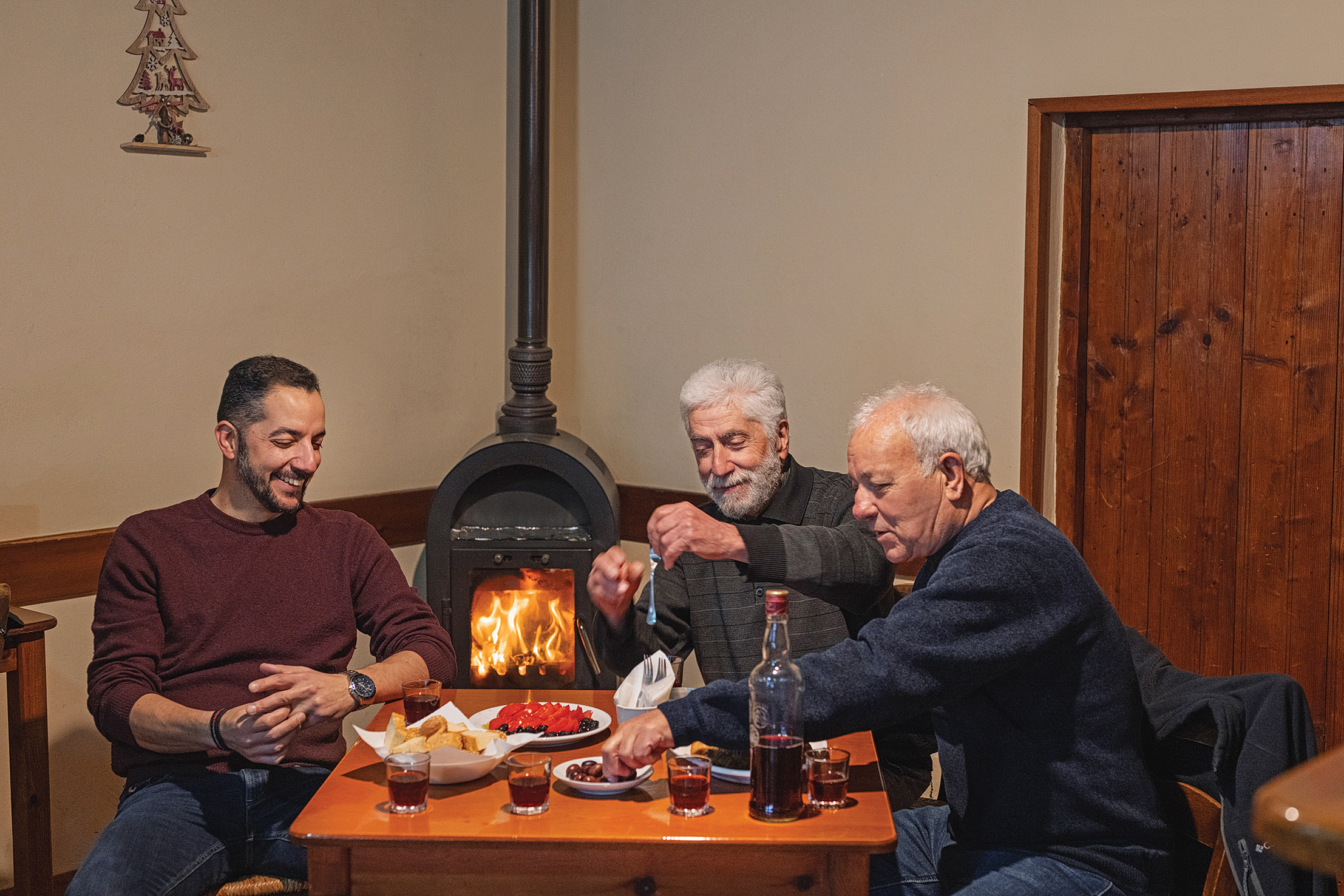 Στη Δρακόνα Κολυμβαρίου, στο μοναδικό καφενείο που συντηρεί ο Μιχάλης Παπαδάκης, γευτήκαμε μεζέ από τα χέρια του, αλλά και καλιτσούνια από τη σύζυγο του Πολυχρόνη Σημανταράκη. Μαζί τους και ο γιος του Μιχάλη, Μανώλης. Φωτό: Αλέξανδρος Αλεξανδρής